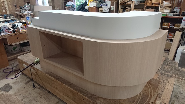 夏真っ盛りセミ大合唱の月曜日。 すべてのセクションが完成すると6mを超すラウンド形状のメインカウンター。