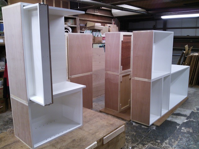 暑さ厳しい猛暑日の月曜日。 大量の店舗什器で溢れている工場内、検品が済み出荷待ちのホワイト什器。
