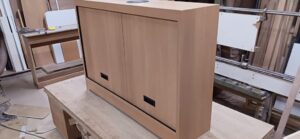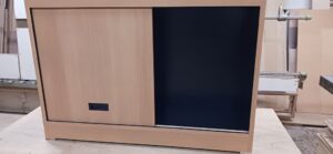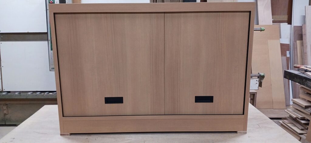 2025.12.19 くるりんぱ 北風が冷たい乾燥した冬晴れの金曜日。w1480×h870×d290㎜サイズのワイド&ナローな専用キャビネット、厚めの天板と本体が一体成形されたシームレスなデザイン、オフセット配分されたフロントパネルは作業性を高めた完全取り外し可能なケンドン式を採用、天板トップにはマットブラックコーティングのくるくる回る回転リッドを装備、外装は七分消しUC風のヒノキ柾目柄化粧板、内装はソリッドブラックの化粧合板仕上げ。