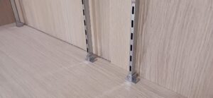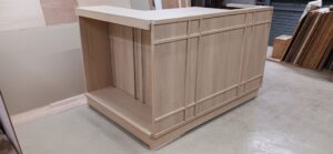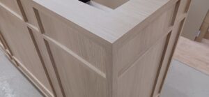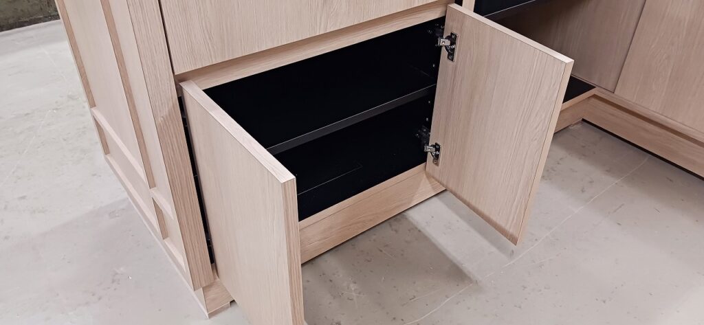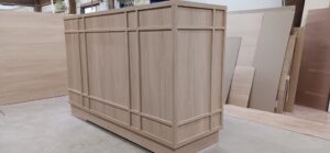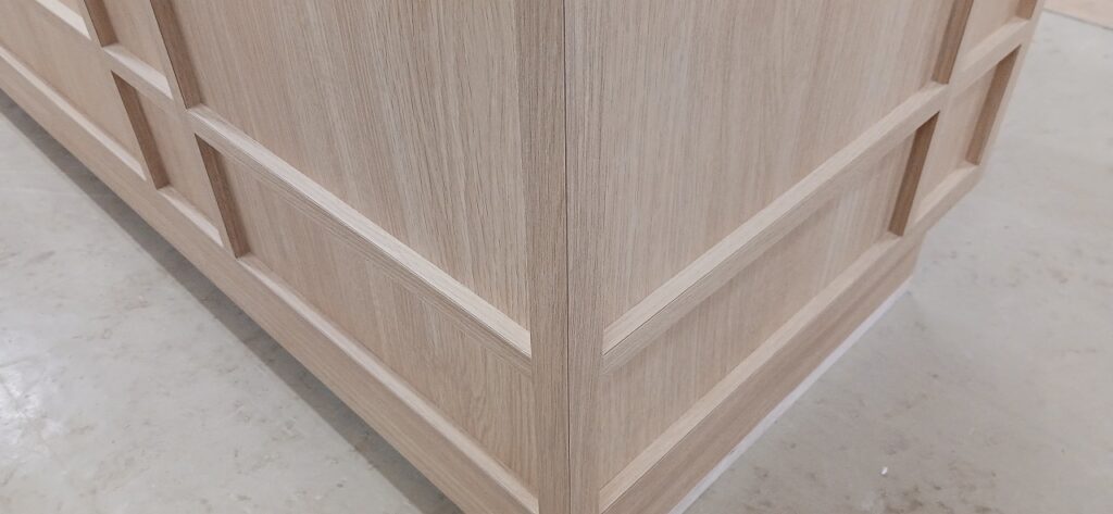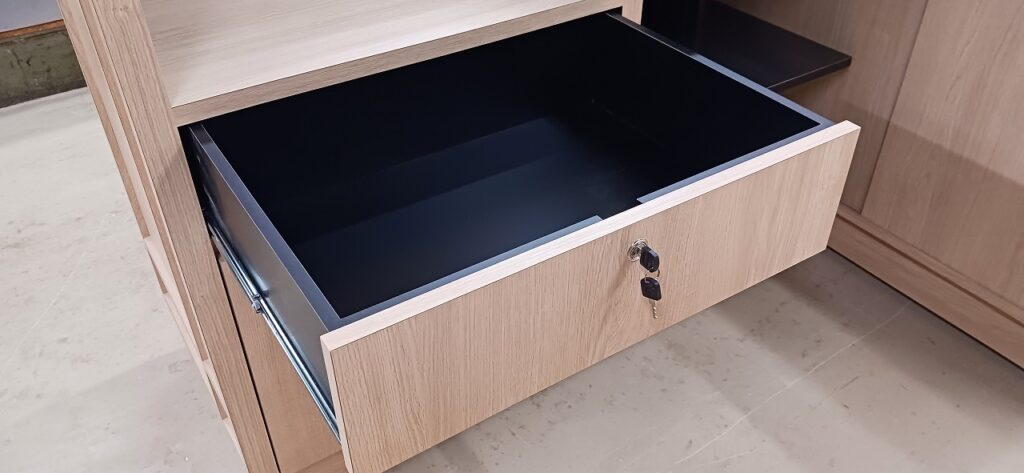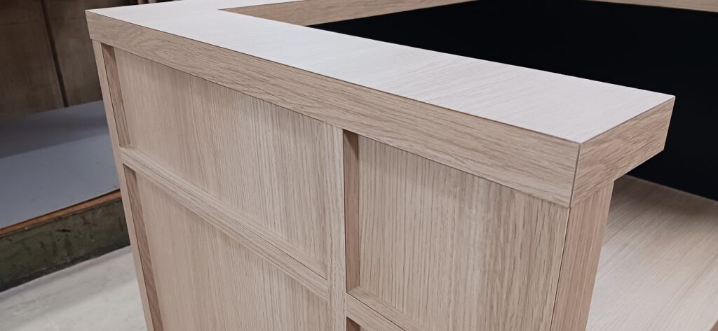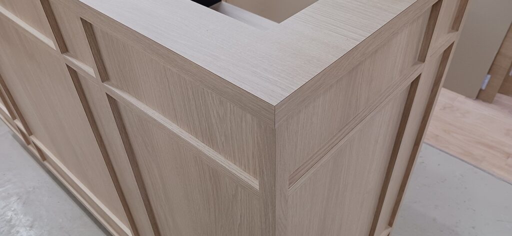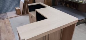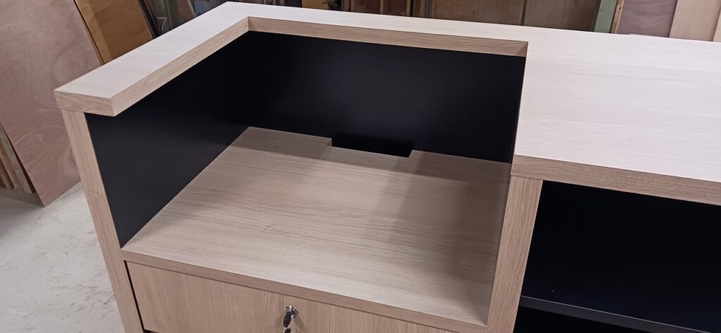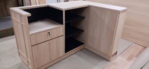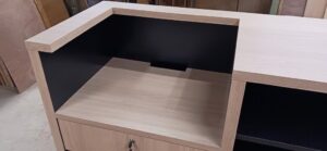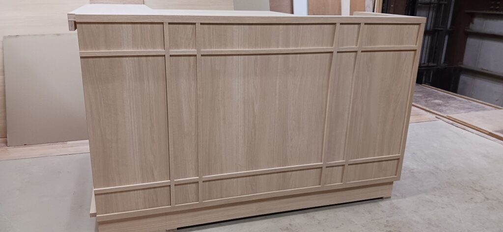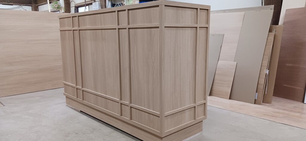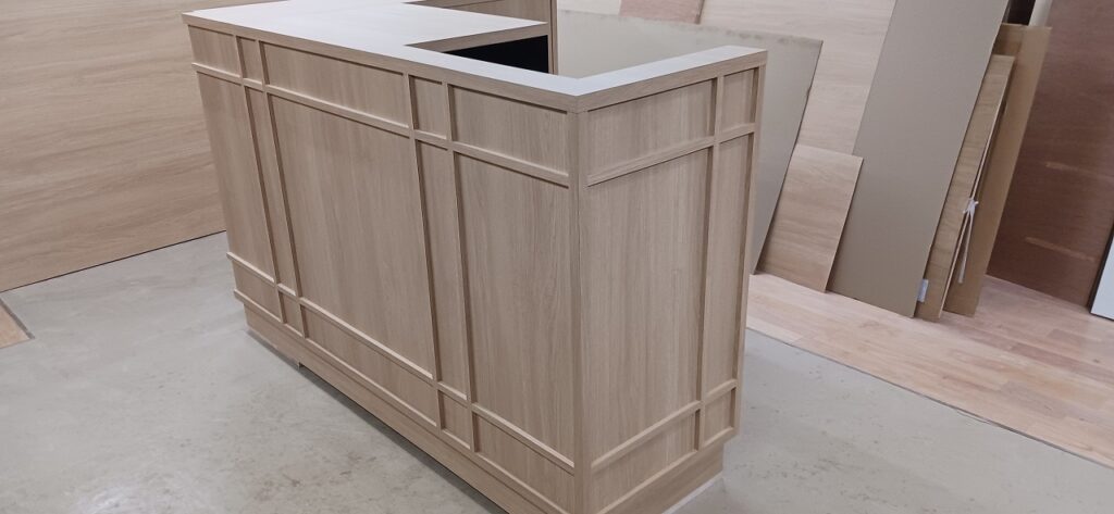 2026.03.16 エントランスカウンター 過し易い快晴冬晴れの月曜日。w1400+1000×h1200×d600㎜サイズのL型カウンター、業務機器が収まる天板下に錠前付き引出と大容量の収納スペースを配備、メインカウンター脇には硝子製の陳列棚4枚を装備、本体外装腰部分には格子状にリブ装飾された檜柾目柄のメラミン化粧板仕上げ、内装はマットブラックのポリ合板仕様、全体的にRやカーブ形状を取り入れず、点と線で構成されたエッジの効いた和モダンな佇まい。