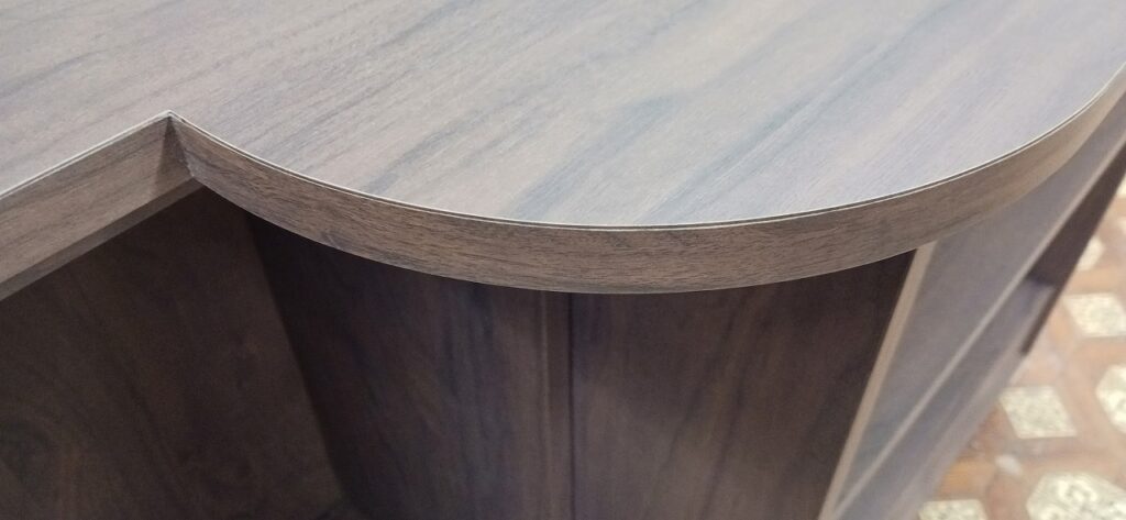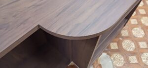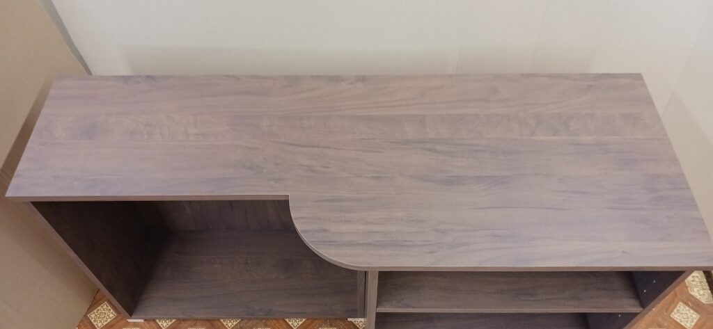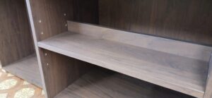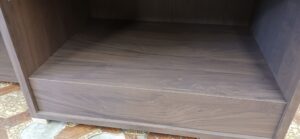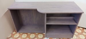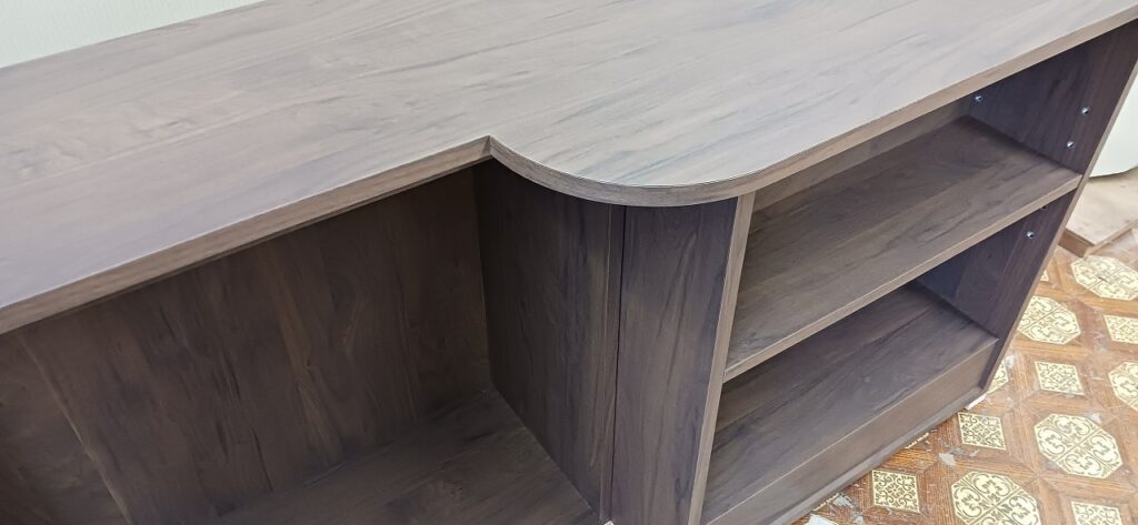 2025.12.04 カウンターキャビネット 北寄りの冷たい風が吹く快晴の木曜日。w1400×h800×d550㎜サイズのカウンターキャビネット、本体中央を境に浅い奥行と深い奥行のスパンに分けた専用形状、右側BOXにはコボレ止めを付けたL型可動棚と、床から120㎜底上げされたシークレットスペースに取り外し式カバーを装備したカスタムデザイン、天板も本体も全てダークブラウン色のウォールナット板柾柄メラミン化粧板仕上げ。
