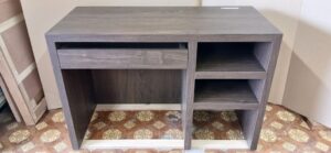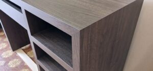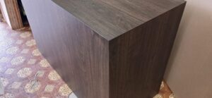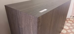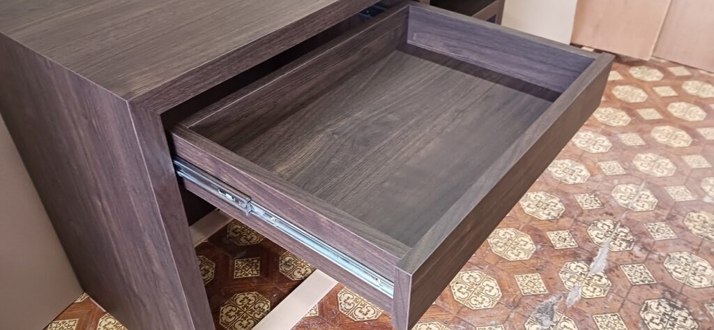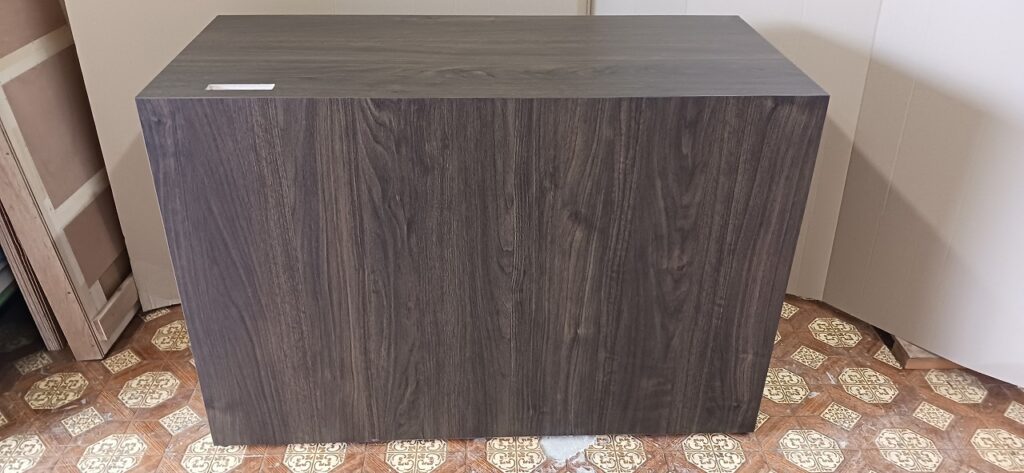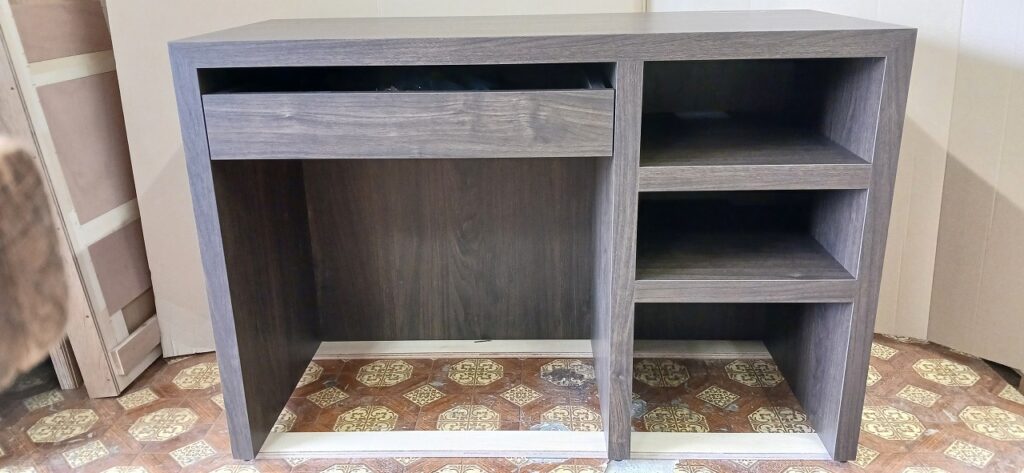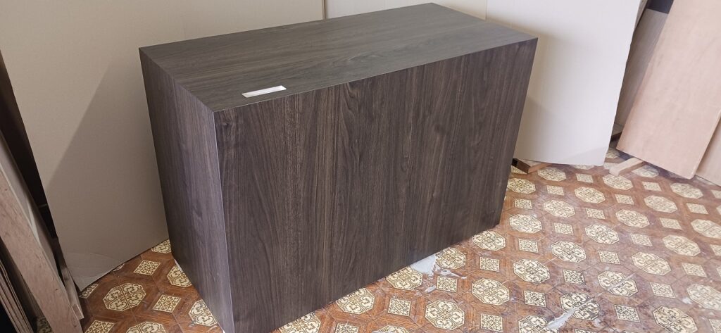 2026.03.28 カウンターデスク 好天に恵まれた桜満開お花見日和の土曜日。w1200×h800×d600㎜サイズのパーソナルデスク、コンセントが埋め込まれる広大なワークトップ下にスリム&ワイドなスリット付き550㎜フルオープン引出とオープンラックを装備、本体正面以外は小口を露出させないフラットなのっぺり仕上げ、全体的に板厚40㎜で構築された重厚感あるデザイン、引出内部も含め全てダークブラウンウォールナット板柾柄の総メラミン仕様。