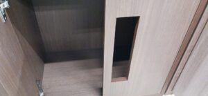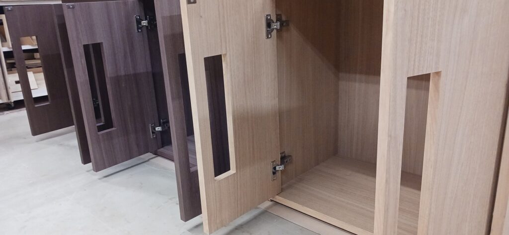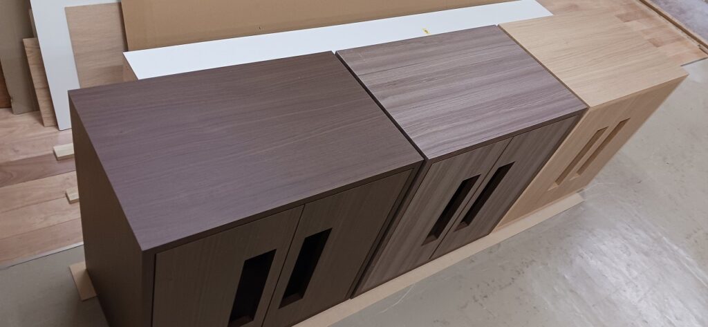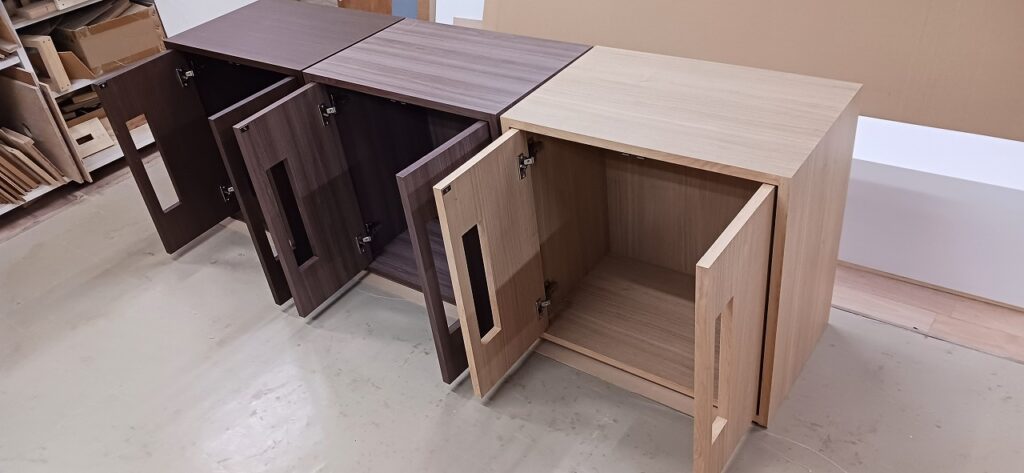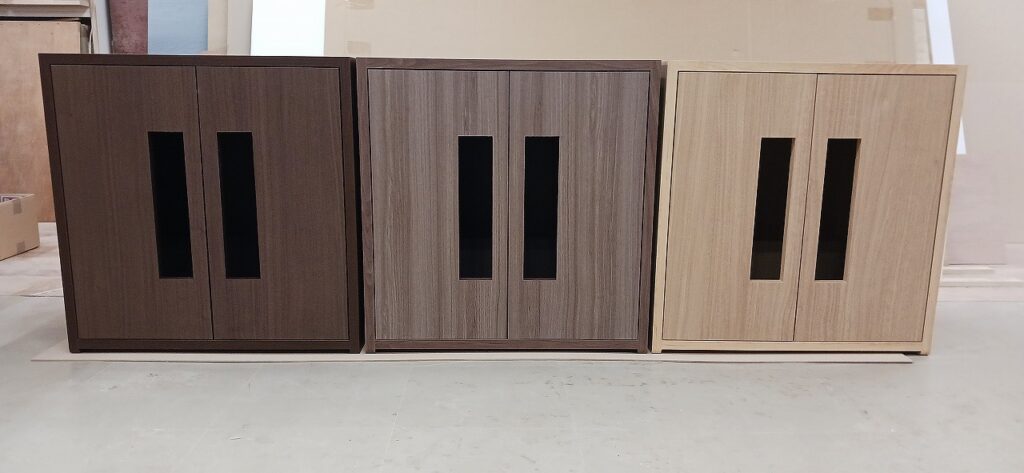 2025.12.01 キドニーグリル ポカポカ陽気で過し易い秋晴れ快晴の月曜日。w600×h600×d450㎜サイズの正方形型収納キャビネット、各タイプ共に内外装を統一したフル化粧仕上げ、プッシュオープンタイプの両開き扉は大きな開口窓を施した独特なカスタムデザイン、本体は耐水効果を意識した総メラミン貼り仕様、オークとアッシュ柾目柄のダーク・ミデアム・ライトの三色カラーバリエーション。