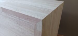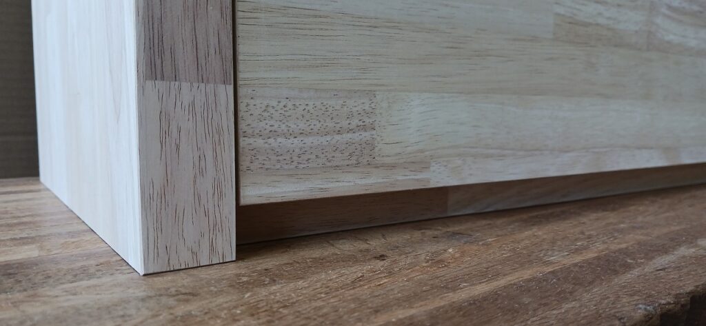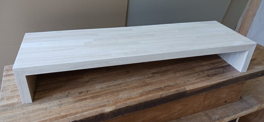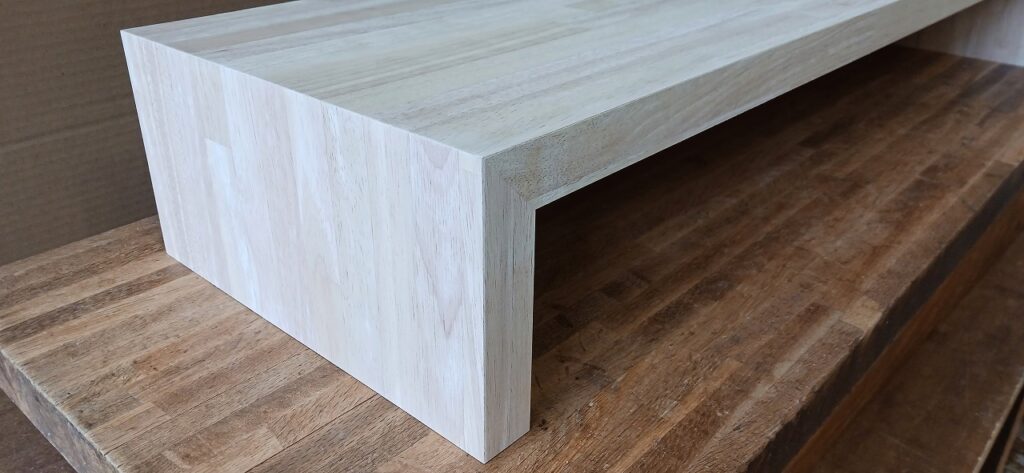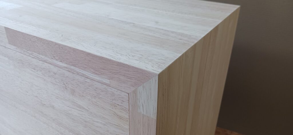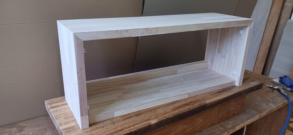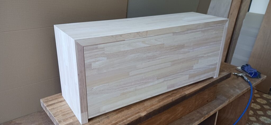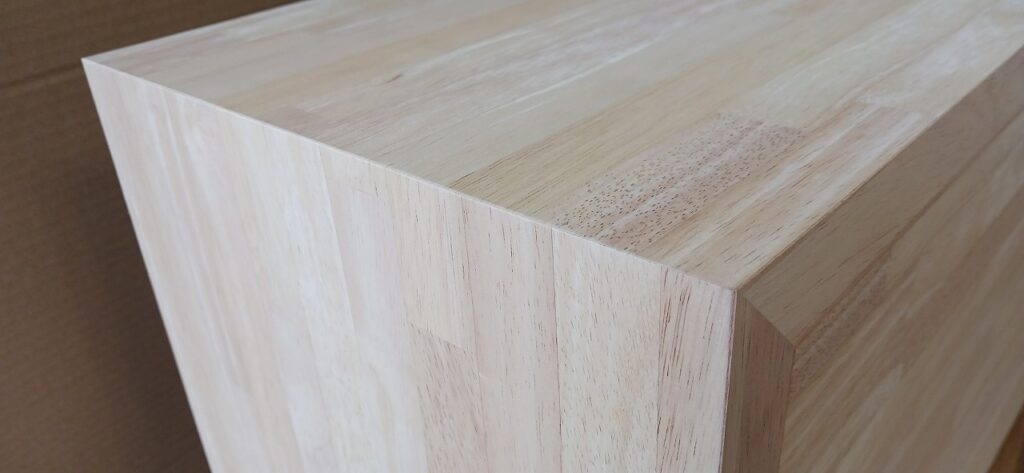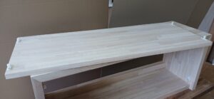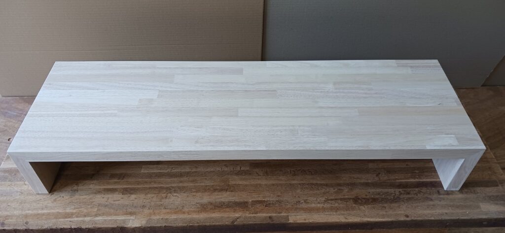 2025.11.17 ゴムの木 日に日に紅葉が進む穏やかな冬晴れの月曜日。w1280×H430×D400㎜サイズの収納付ベンチとマルチステップ、ゴム集成材を薄い板状にしたもので堅木下地をラッピングしていくひと手間掛けた拘り製法は、ビス跡を残すことなくしっかりと強度も保てる優れた組立構造、温かみのあるソフトで優しい手触感のゴムブロック素地仕上げ。