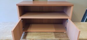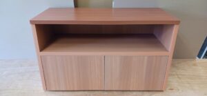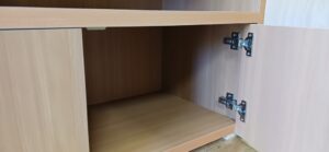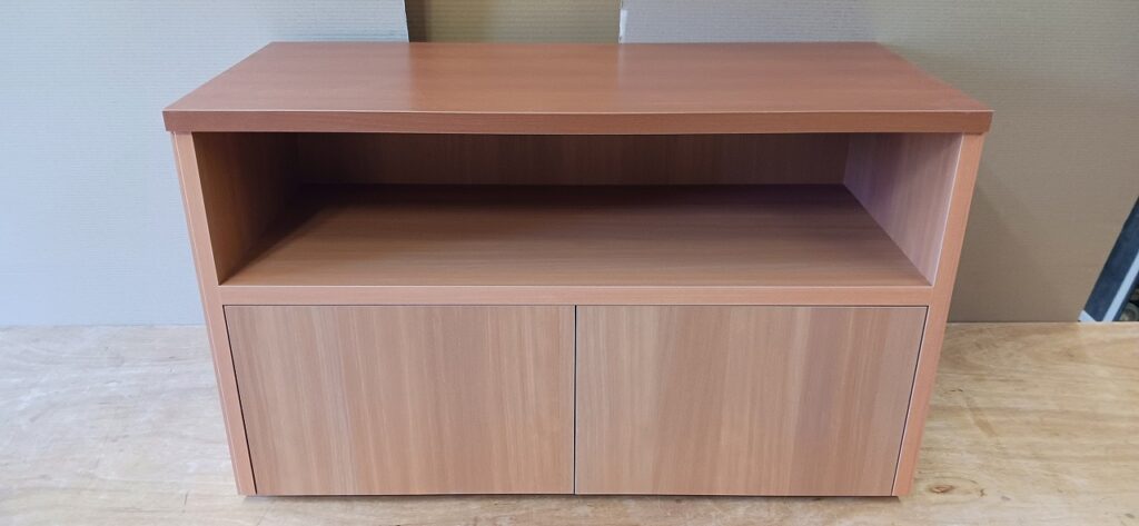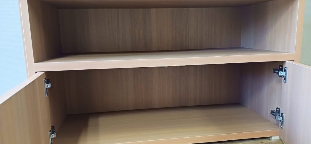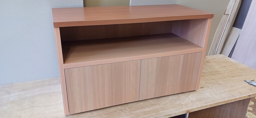 2026.02.05 サイドカウンター mini 寒さ和らぐ穏やかな陽気の木曜日。w850×h500×d450㎜サイズのカウンターキャビネット、決められたモノが収まるジャストサイズのオープン棚と扉付きストッカースパンで構成された専用キャビネット、天板はライトブラウン色のホワイトバーチ追柾柄メラミン化粧板、本体はゼネラルバーチ柾目柄のポリエステル化粧合板仕上げ。
