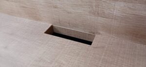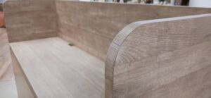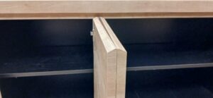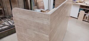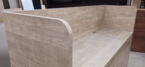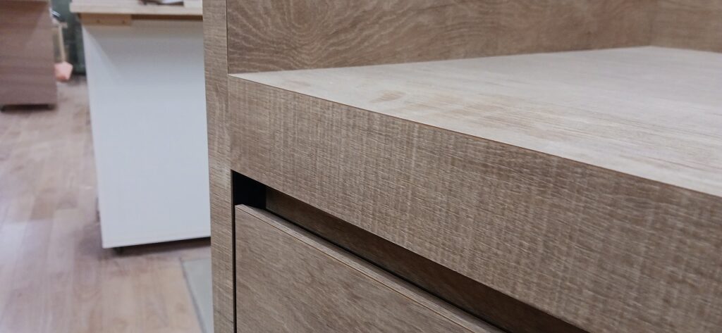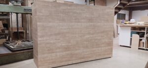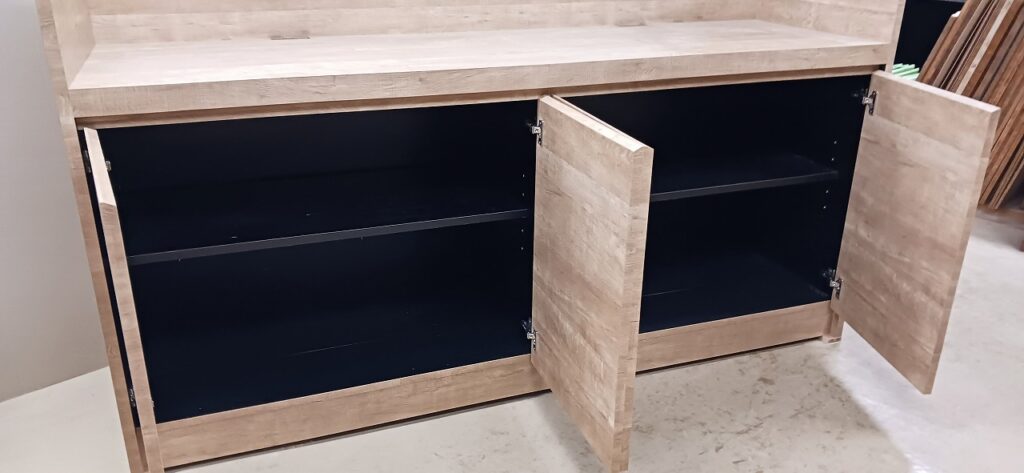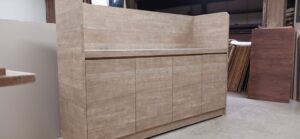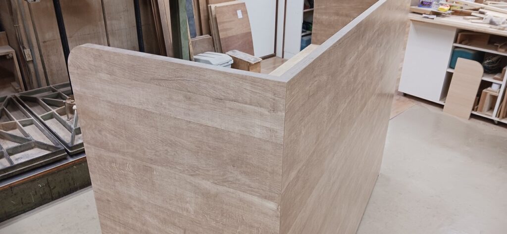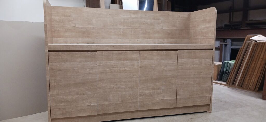 2025.12.10 サブ カウンター それほど寒さを感じない気持ちよい晴天の木曜日。w2200×h1500×d650㎜サイズの大型カウンターキャビネット、サイドパネルとバックパネルでキャビネットを包み込んだ全面化粧仕上げのアイランドデザイン、板厚60㎜のボリュームある天板下は可動棚2枚の大容量ストッカースペース、外装はエルム追柾柄のメラミン化粧板仕上げ、内装はソリッドブラックのポリ合板仕様。