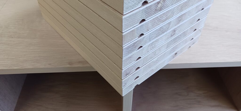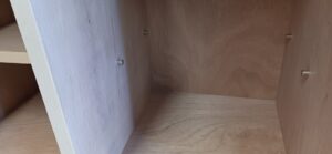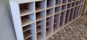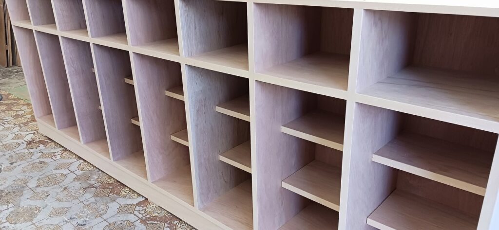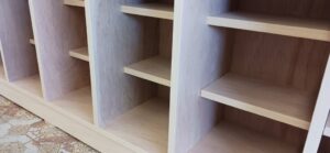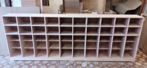 2026.01.31 シューズロッカー 冷たい北風が強めに吹く快晴の土曜日。w3000(2400)×h1100(900)×d350㎜サイズのオープン下駄箱、一部スパンに棚ダボを使用した取り外し可能な棚を装備、ロングタイプは最大50足、ショートタイプは32足を収納可能なマス目仕様、外装は白ラワン突板仕上で内装はラワンベニヤ仕様、どちらも塗装工程前のナチュラルな仕上がり。