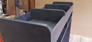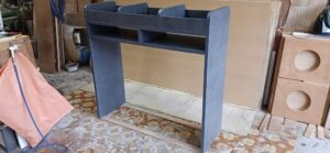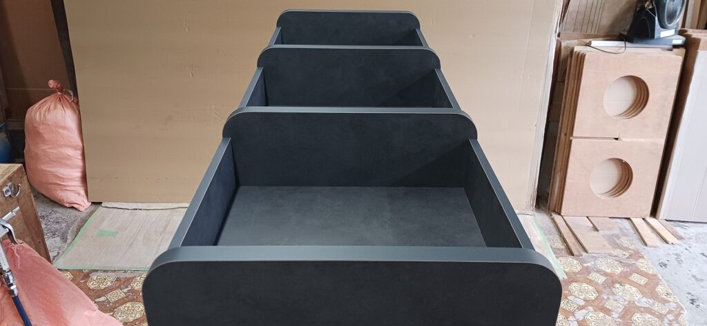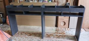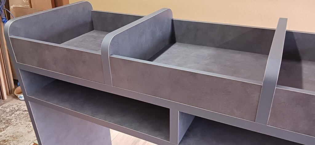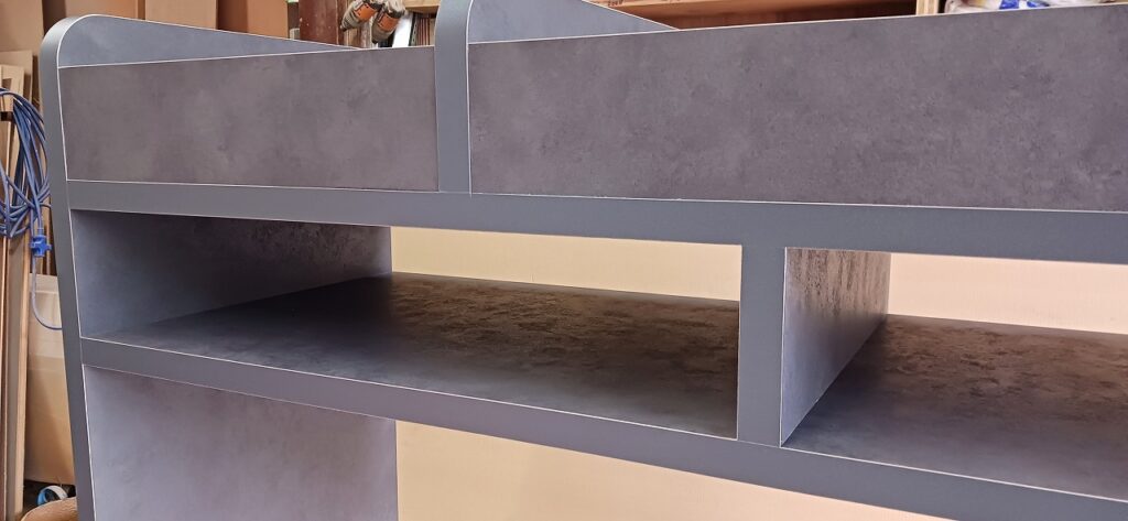 2025.09.25 スタンディングラック カラッと晴れた過し易い陽気の木曜日。w1350×H1300×D500㎜サイズの収納ラック、本体トップは3分割されたトレータイプの物入れスパン、中段は2分割された貫通タイプのオープン棚スパン、長い脚のようなサイドパネル構造は沢山の既存物を跨いで設置できる地板の無いフルオープンスペース仕様、スタンディングワークのように立ちながら物を出し入れし易い設計の全面化粧された両面使い仕上げ。