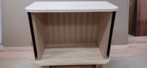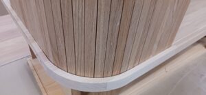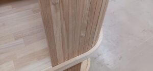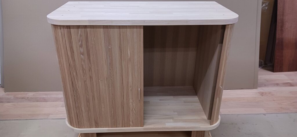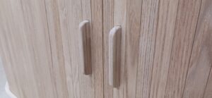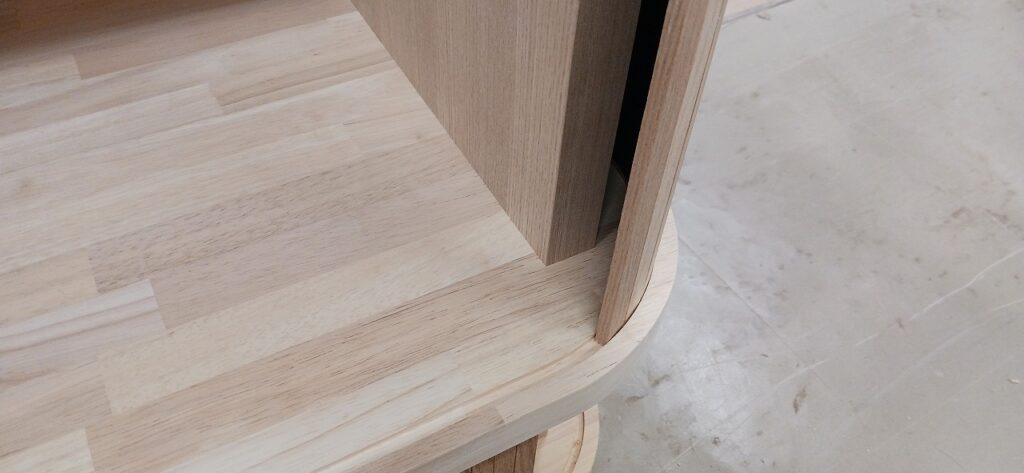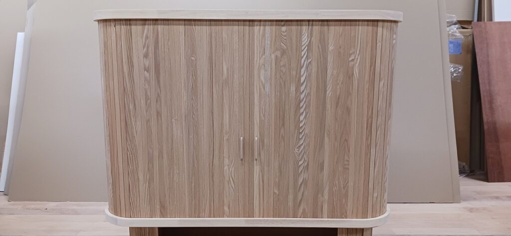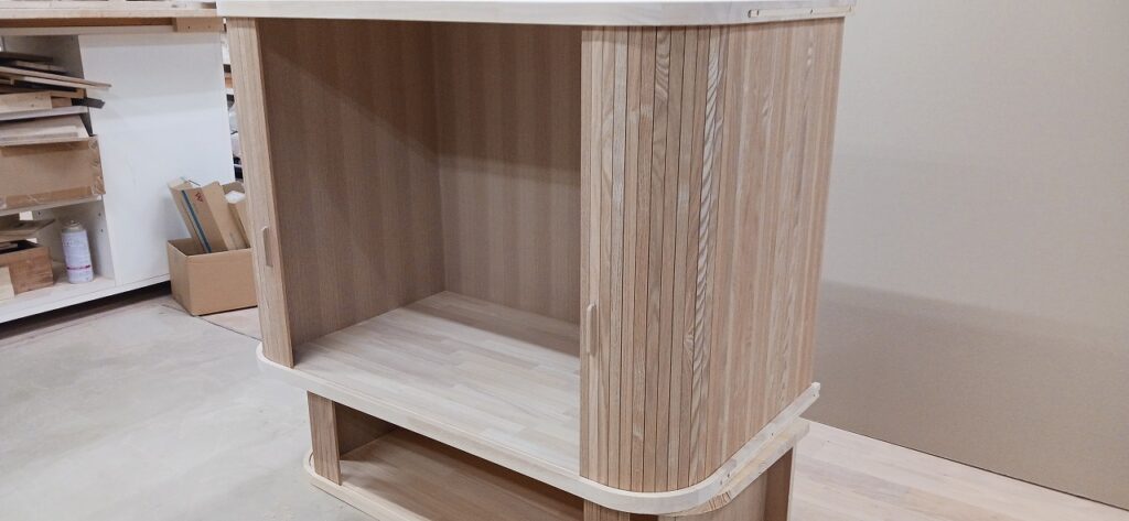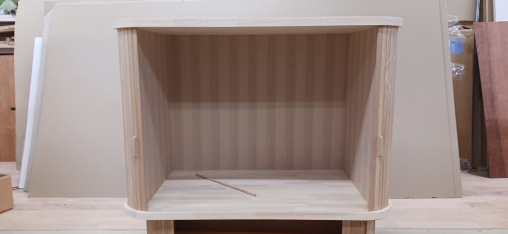 2026.01.21 スライディングシャッター 強い寒気が流れ込む冬晴れの水曜日。w950×h650×d530㎜サイズの垂直収納引戸のキャビネット、トライ&エラーを繰り返し導き出した最適な幅と厚みのホワイトオーク無垢材を一本づつ丁寧に繋ぎ合わせた繊細な作りの引戸、ゴム集成材で上下から挟み込んだ突板仕上げのキャビネット内部はプレシャスなアイテムがぴったり収まりストレス無く出し入れできるように設計された専用構造。