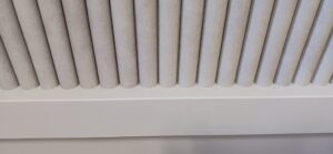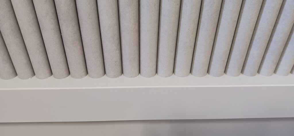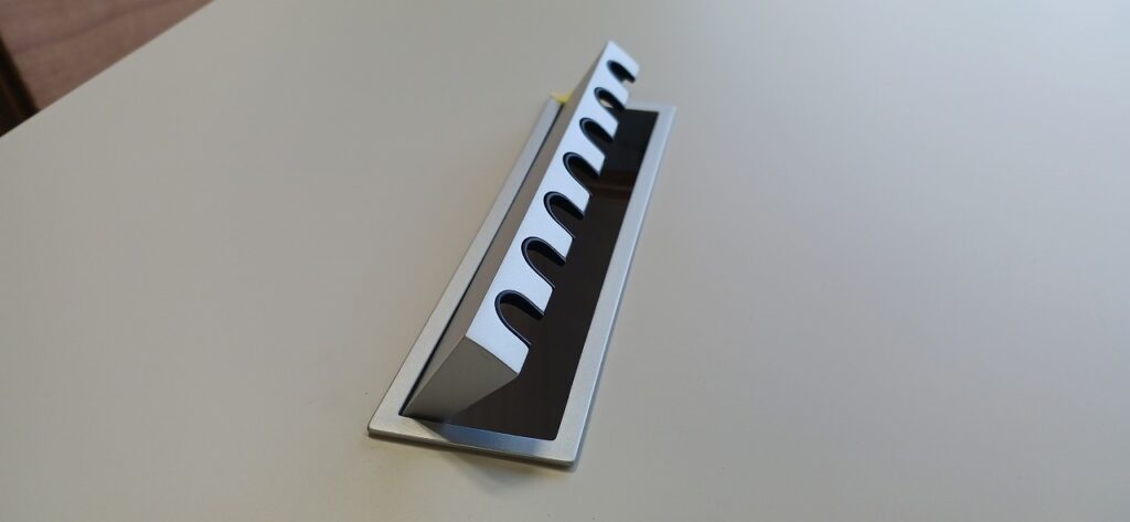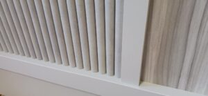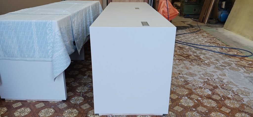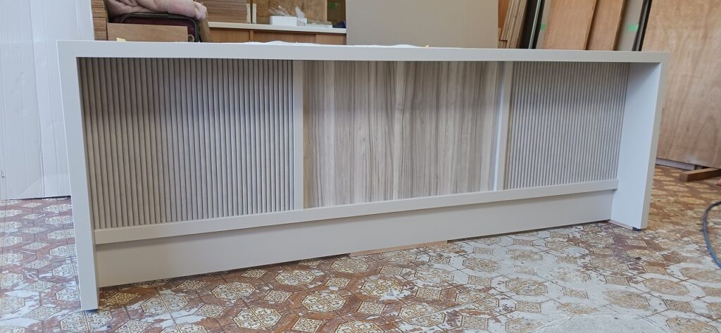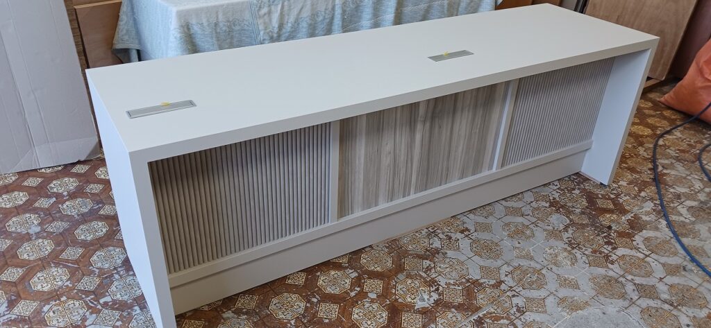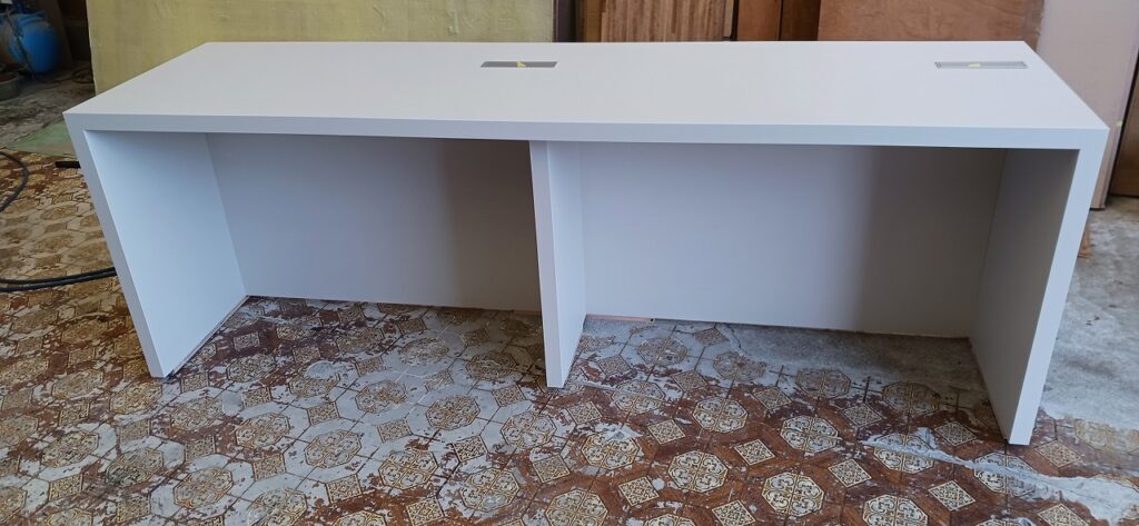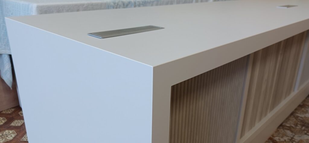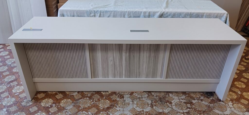 2026.04.07 デザインカウンター 北風が強まる桜散らしの火曜日。w2400×h750×d600㎜サイズのローカウンター、シンプルで機能的なバックヤードサイドとは対照的に、エッジィな枠内に半丸状のリブパネルを装飾した柔らかなイメージとマーブル調の淡い色柄を織り混ぜたシックなデザイン、厚さ50㎜の重厚感あるワークトップにはマットシルバーの開閉式ケーブルキャップを2連装備、本体はしっとりとした手触りが特徴的なマットライトグレーのメラミン化粧板仕上げ。