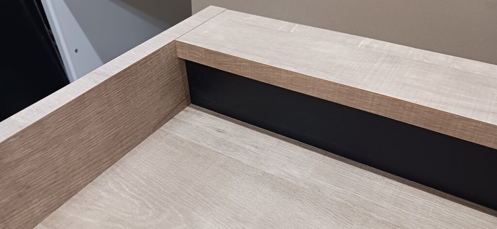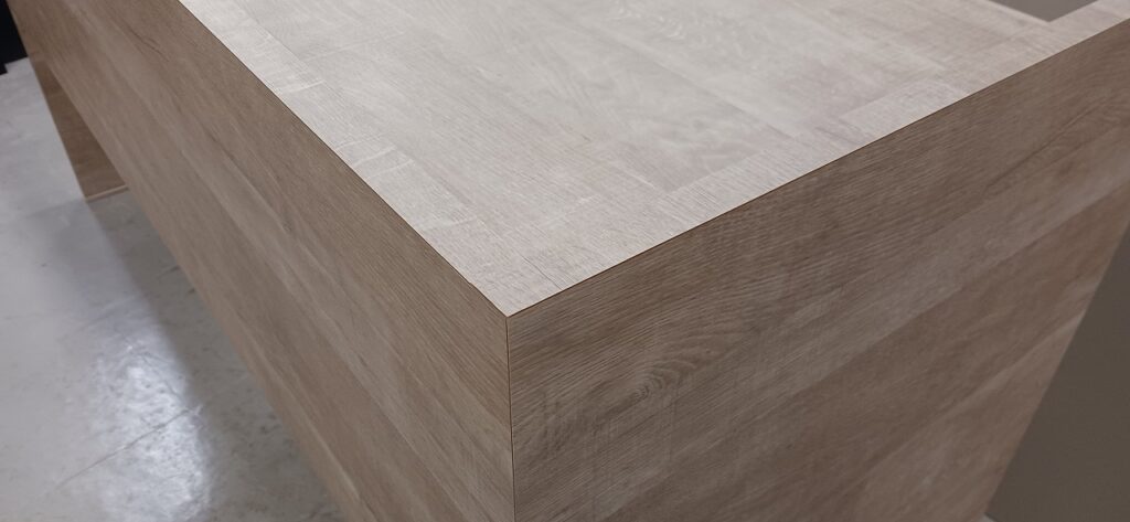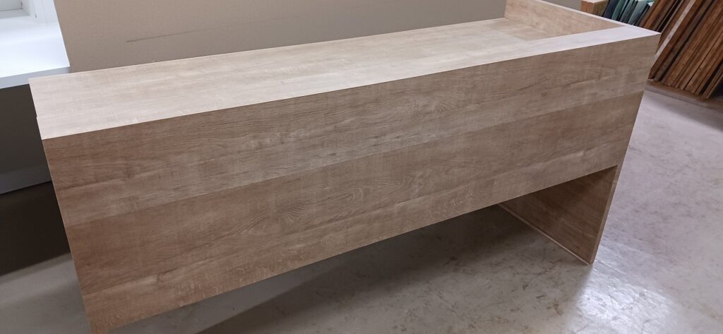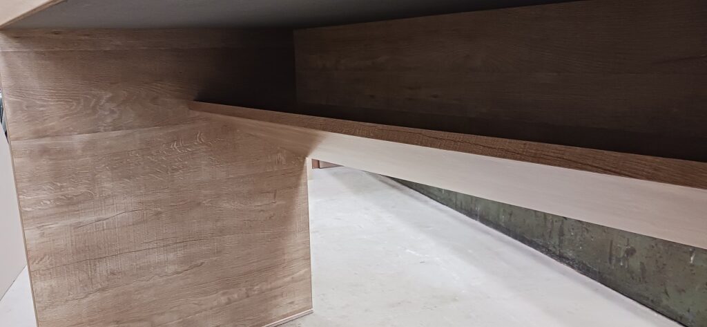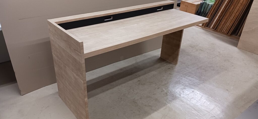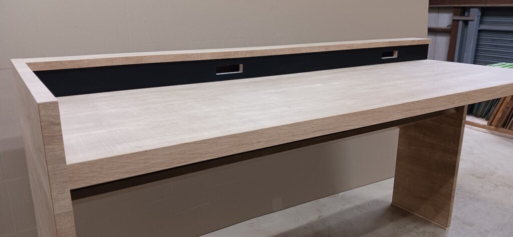 2025.11.29 パーソナルデスク 眩しかったサンライズと暖かなサンセットに癒される冬晴れの土曜日。w1500×h800×d700㎜のミッドサイズデスク、全面化粧されたアイランドスタイルにサイド&バックガードをあしらったカスタムデザイン、立上ったマットブラックのライニング下にコンセントとUSBポートを装備、ワークトップ下には傾斜させたカンガルーポケット型の物入れ棚も装備、本体はライトブラウン色の剥ぎ板風オーク板柾柄メラミン化粧板仕上げ。
