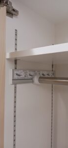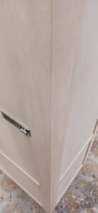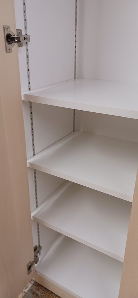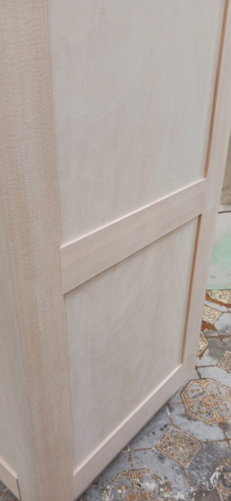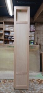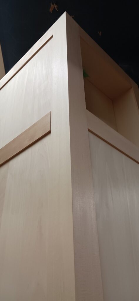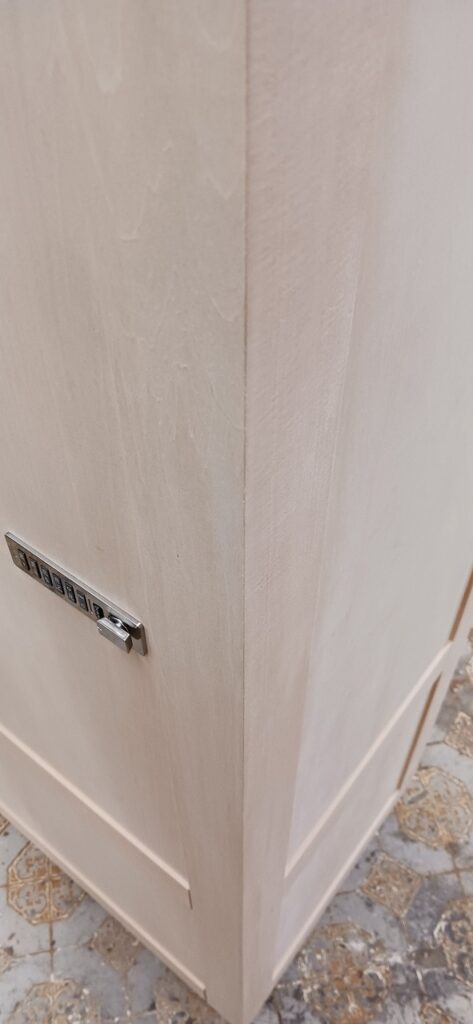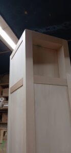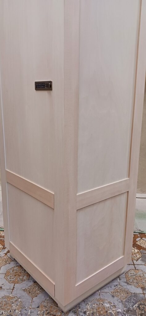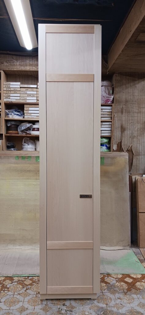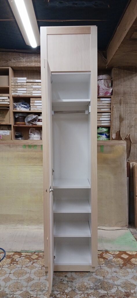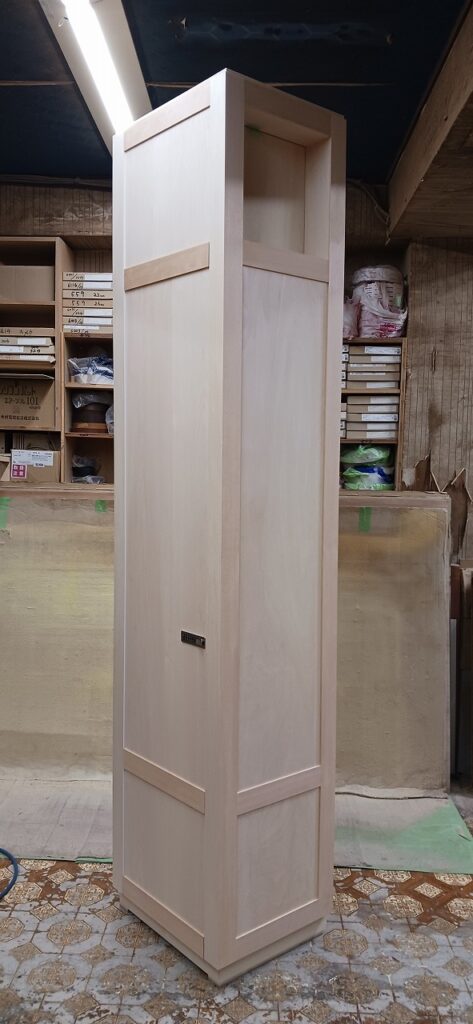 2025.09.10 プライベートキャビネット 午後イチからどしゃ降りの雨が降り出した蒸し暑い水曜日。w600×h2400×d500㎜サイズの大型トール収納、最終的に全塗装する事を前提に構築された外装は、シナベニヤをベースに幅と厚みのあるスプルス無垢材を框装飾した重厚感あるデザイン、収納内部は4枚の可動棚と任意の上下前後移動が可能な4wayシステムハンガーパイプも装備、棚受けダボレールは内壁に溝加工を施しレール本体を埋め込んだカスタムスムージング仕上げ、扉には引手兼用のテンキータイプ電子錠を採用したセキュリティシステムを装備。
