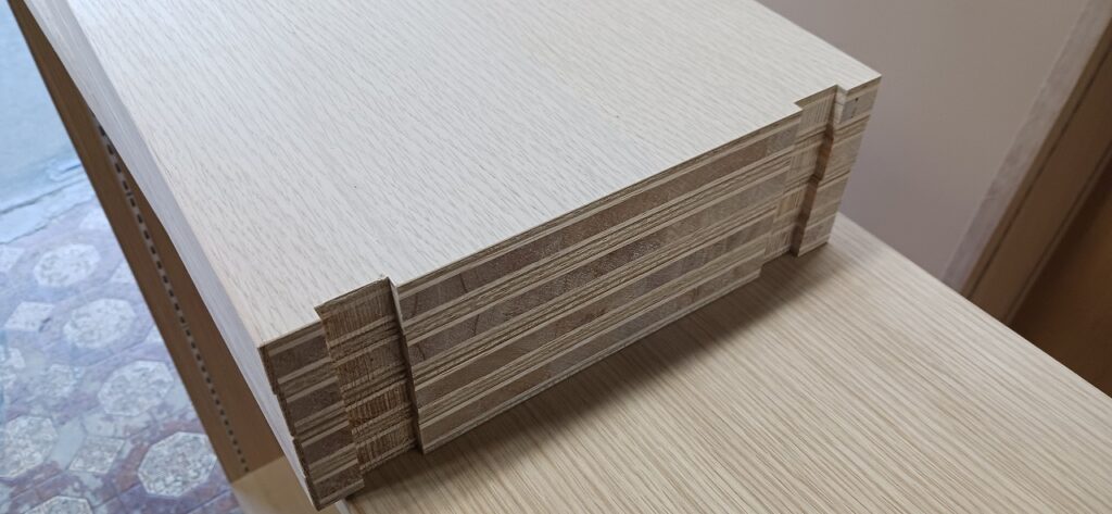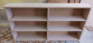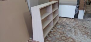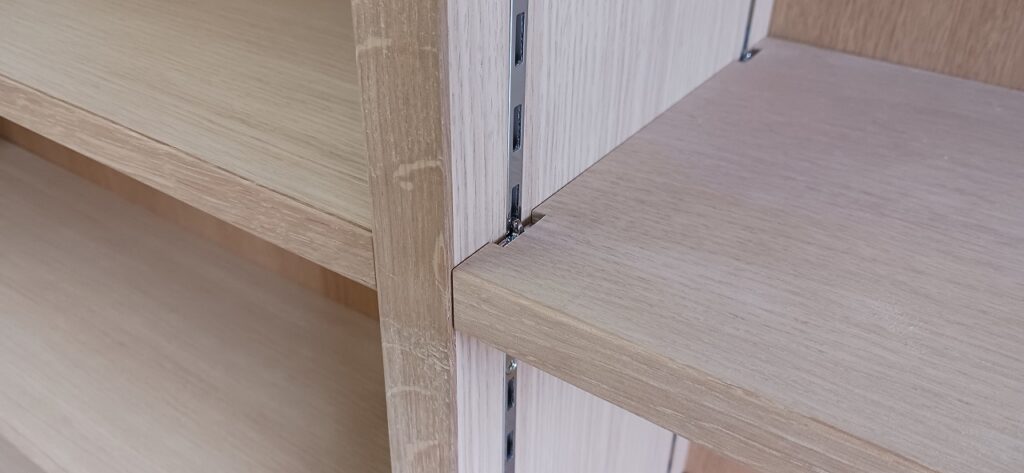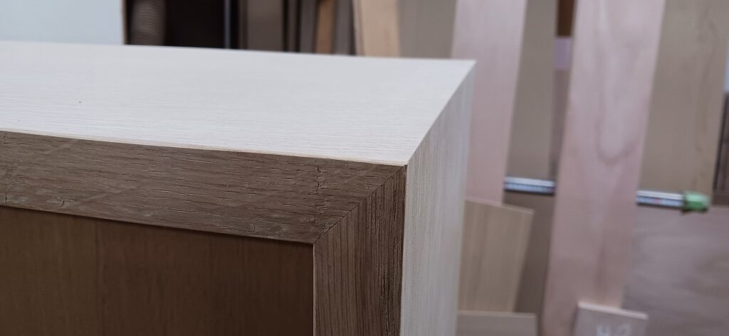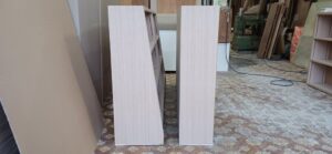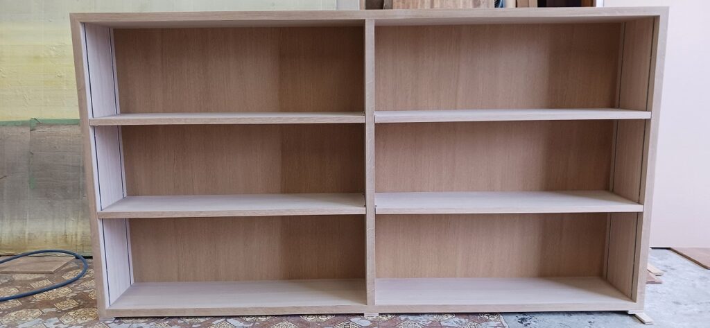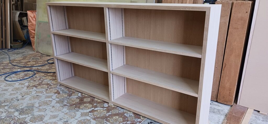 2026.01.24 傾斜本棚 最強寒波の影響でストーブを点けてしまったとても冷たい冬晴れの土曜日、w1750×h1100×d270㎜サイズ本棚、通常のストレートタイプと棚板・背板共に傾斜させた図書館タイプ、どちらも棚柱を埋め込み加工し、棚板にも専用ダボ加工を施した強固な脱落防止仕様、外装はナラ柾目突板の本体小口にナラ無垢材を貼り付けた挽板仕上げ、背板は塗装後の本体と同化するナラ柾目の化粧合板仕上げ、見た目も手触りも天然素材の温もりある優しい佇まい。