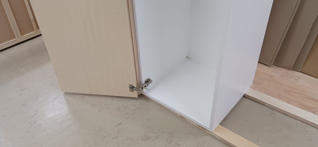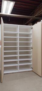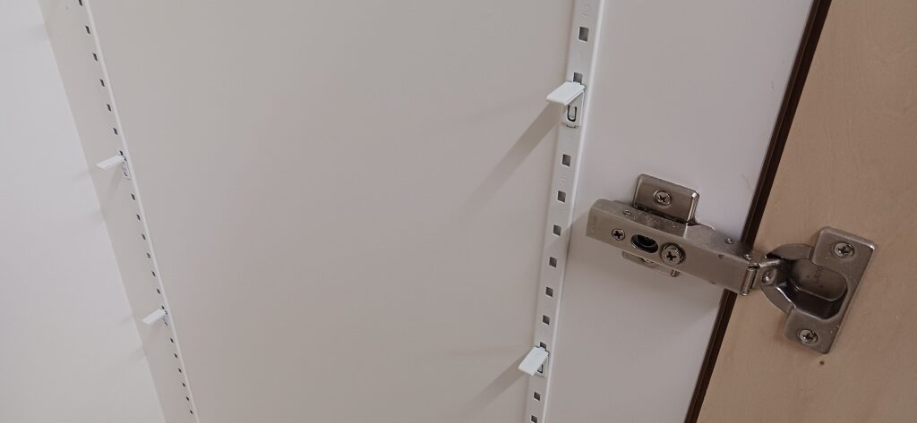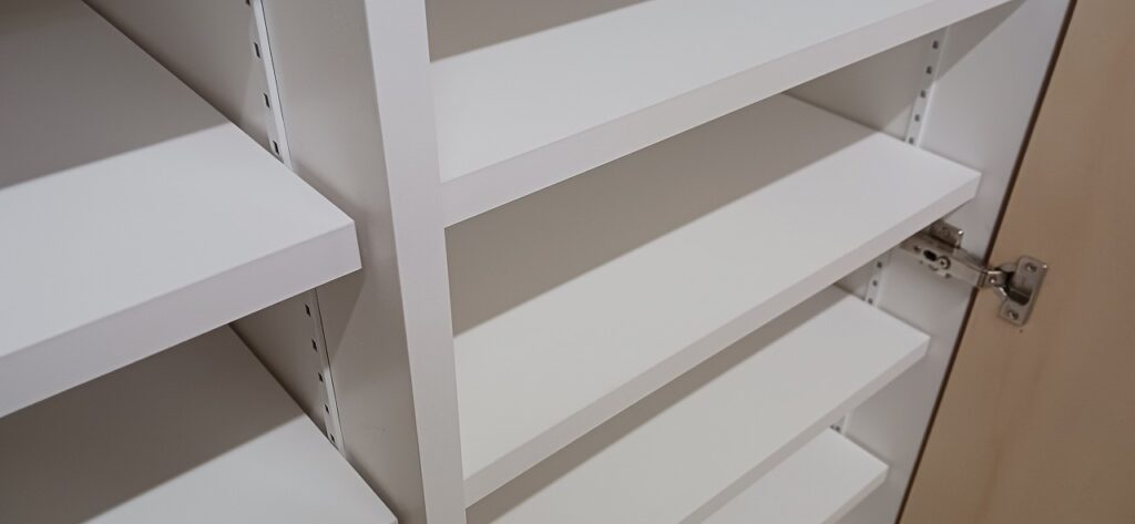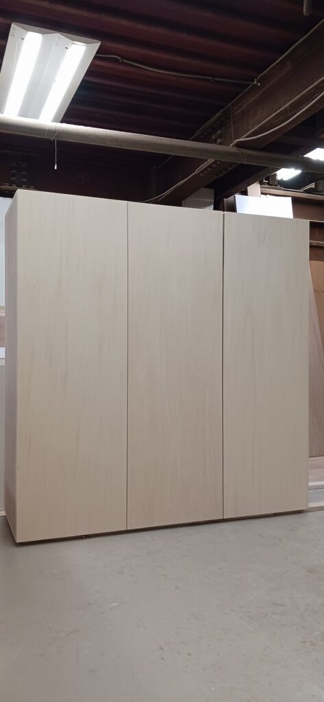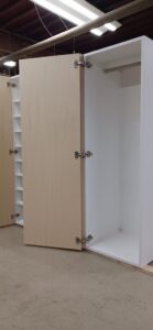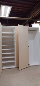 2026.01.30 ダイナミックオープン 陽射しが暖かい穏やかな冬晴れの金曜日。w1600×h1650×d570㎜サイズのミドルレンジキャビネット、中央間仕切パネルを設けた大開口の観音開きスパンは主に外装用として使われるエンボス質ホワイト化粧合板仕上にホワイトカラーの棚柱と棚受を装備、開き角180°の広角度丁番を装備した片開きスパンは長いモノも楽々収まるハンガーパイプ付の長尺物スパン、扉はナチュラルなシナ合板仕上。