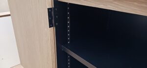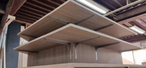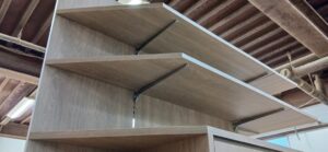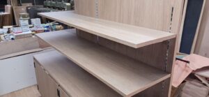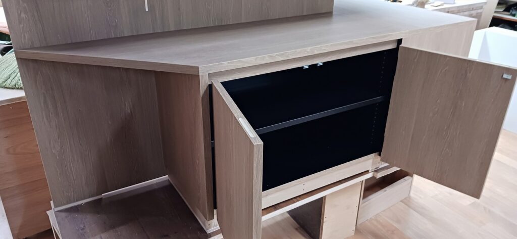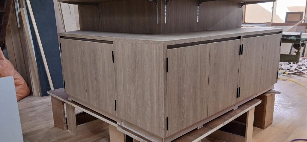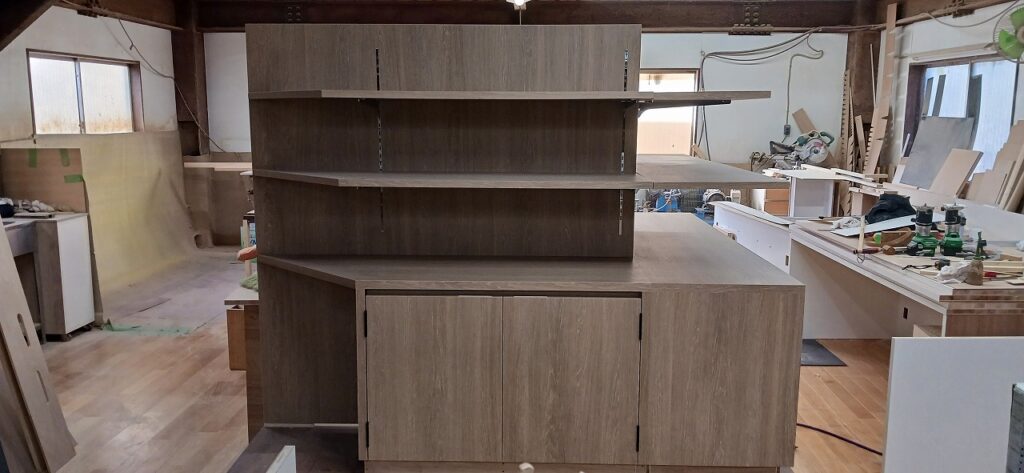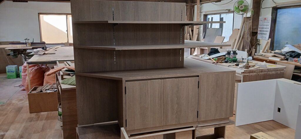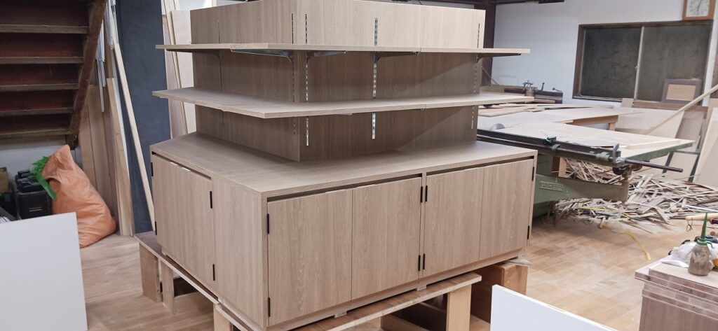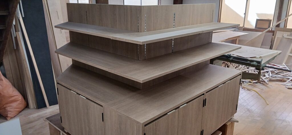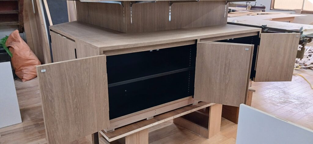 2025.11.07 桜紅葉 雲一つない青空にさくらもみじが映える快晴の金曜日。w1600+1600×h1500×d500㎜サイズの専用什器、柱を覆い隠すように設置される出隅形状のコーナーデザイン、外装はミデアムブラウンのオーク柾目柄メラミン化粧板仕上、ストッカー内部はダボレールを埋め込みセットしたマットなブラック×ブラック仕上げ。