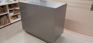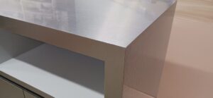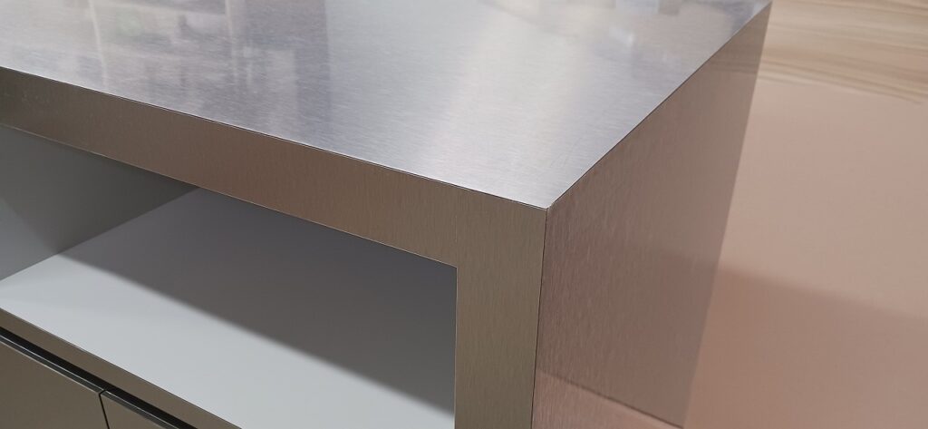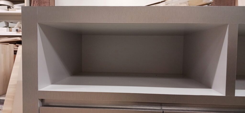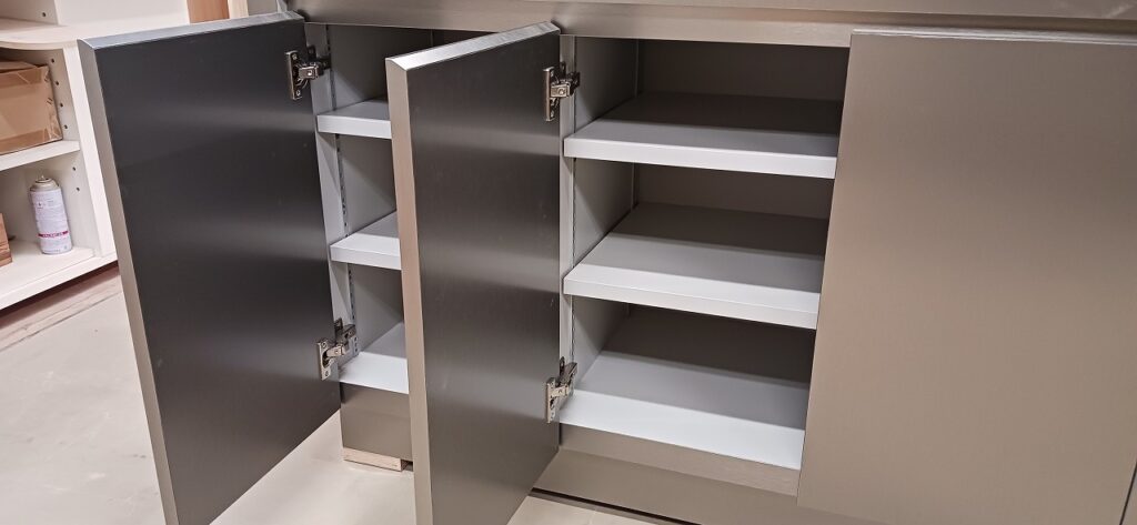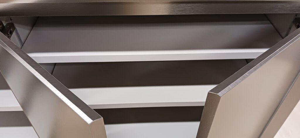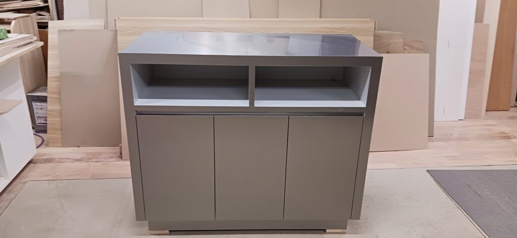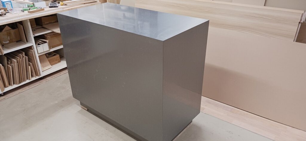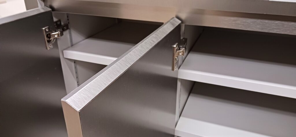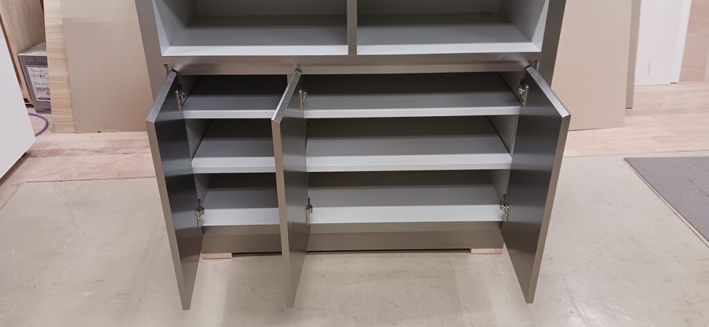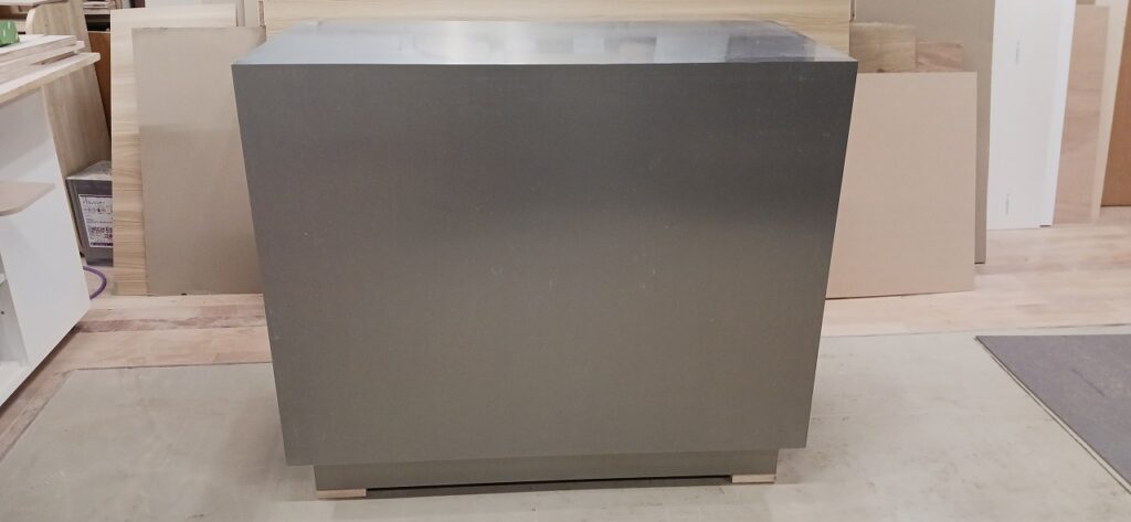2026.04.23 銀河系 冷たい雨降る寒の戻りの木曜日。w1300×h1100×d620㎜サイズのアイランドカウンターキャビネット、カウンタートップ下は左右独立した奥行のあるオープンスペース、その下は3枚扉の大容量収納キャビネットに細かく仕切れる4枚可動棚を装備、全ての収納部分を縦横無尽に連結配線可能なシークレットケーブルスペース構造、土台と独立した本体下部スカート裏面にはLED間接照明も装備、外装はヘアライン処理されたメタル製メラミン化粧板仕上げ、内装はエンボス系艶消しライトグレーメラミン化粧板仕様、保護シートを剥がした扉裏面から発せられる素地の独特な質感と色合いは、近未来を思わせるギャラクシーな輝き。