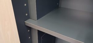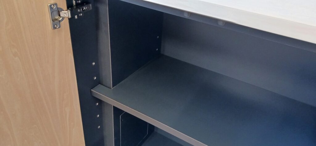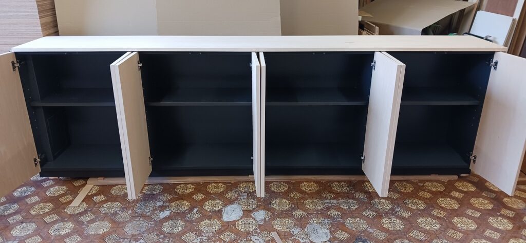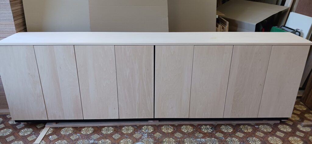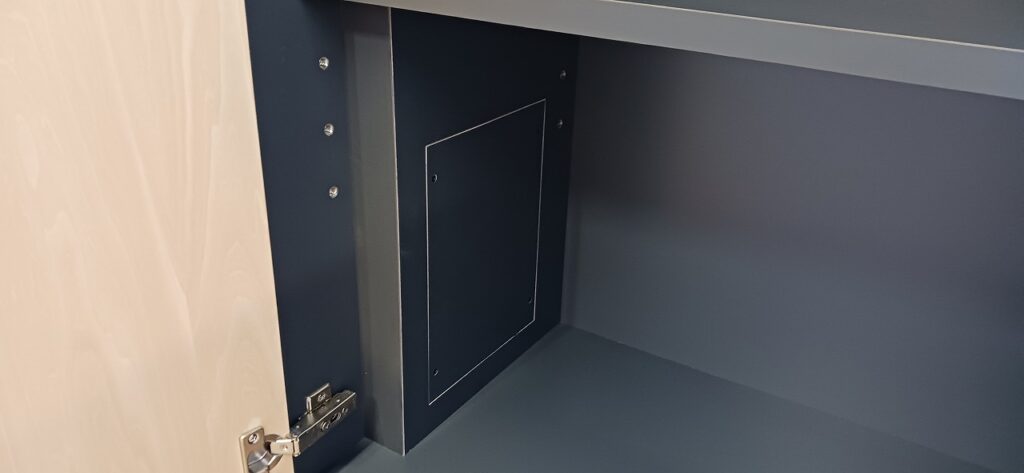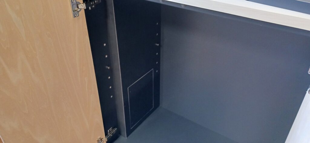 2025.11.26 電装ポケット 風も雲もなく真青な空と乾燥した冬晴れの水曜日。w3200×h900×d380㎜サイズのカウンターキャビネット、本体内部側板部分に大容量の電装スペースを装備した専用設計、扉はハンドルを付けないプッシュオープンタイプを採用、プッシュラッチは本体小口に埋め込みセッティングされた出っ張りの無いスッキリとしたデザイン、外装はシート貼り用下地としてシナ合板仕上げ、内装は微細エンボス質のダークグレーポリ合板仕様。