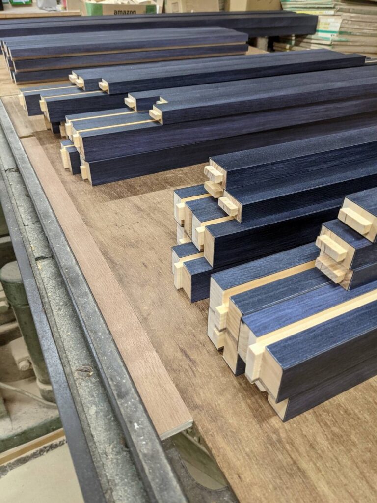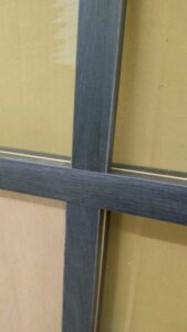 2024.10.19 accent frame キンモクセイの香り漂う青空の土曜日。w900×h2000㎜サイズのシャープな飾り枠、カット硝子や化粧パネルを1枚1枚丁寧に仕込んでいくフルハンドメイド仕様、マットな質感の華奢なフレームは光の加減で紫がかった上品な反射とブルーサファイアの様な青白い妖艶な輝きを放つオーク板目柄メラミン化粧板仕上げ。
