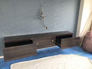 青空と乾燥した空気の清々しい木曜日。 中央の下開き扉の両側に引出を装備、床から300㎜浮かせて強固に壁固定。