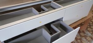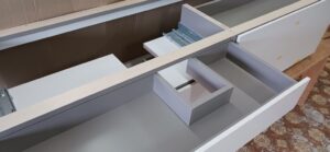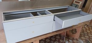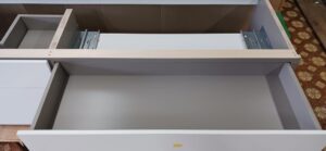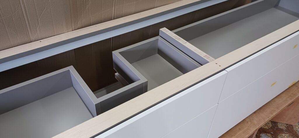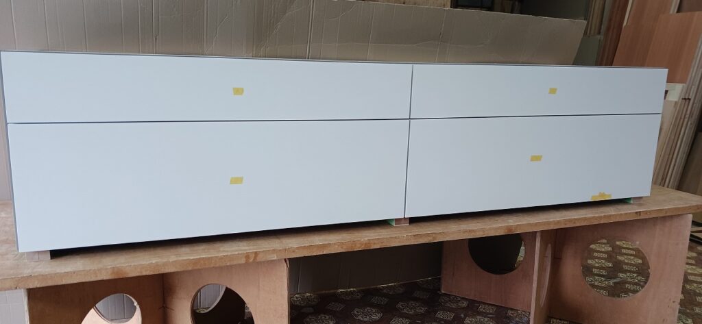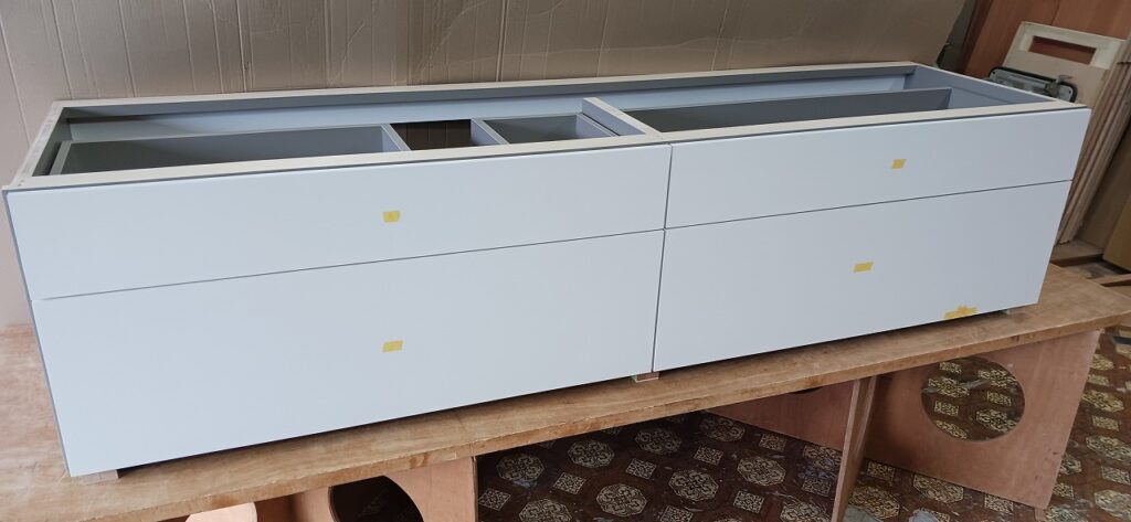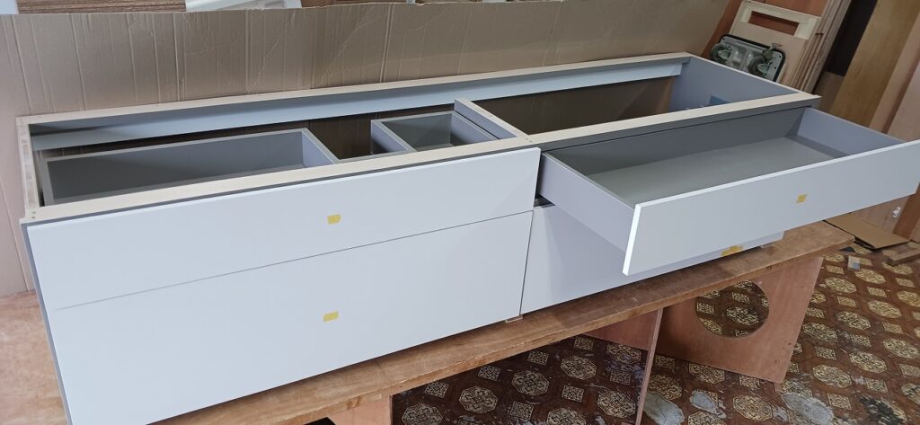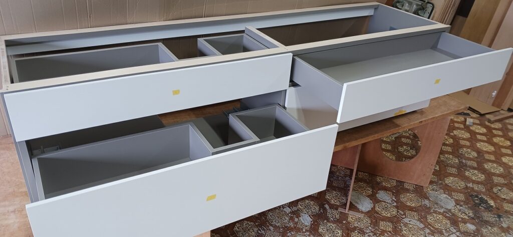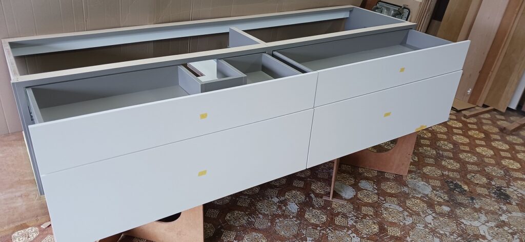 2026.04.09 non-standard 近隣のソメイヨシノは見頃が過ぎた桜吹雪の木曜日。w2300×h450×d630㎜サイズの特特注洗面キャビネット、天然水晶を主成分とした超重量級ストーンカウンターを載せるキャビネットは、床置きせず宙吊り設置を前提に安全性・操作性・耐久性に配慮した構造設計、配管避け加工も施されたハンドルを付けない幅1000㎜オーバーの大型引出は、プッシュオープンとソフトクロージング機構を搭載したハイクオリティなレールシステムを採用、サイズも重量も施工方法も全てが規格外のフルカスタム仕様。