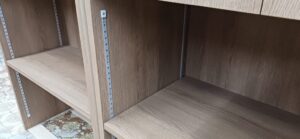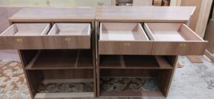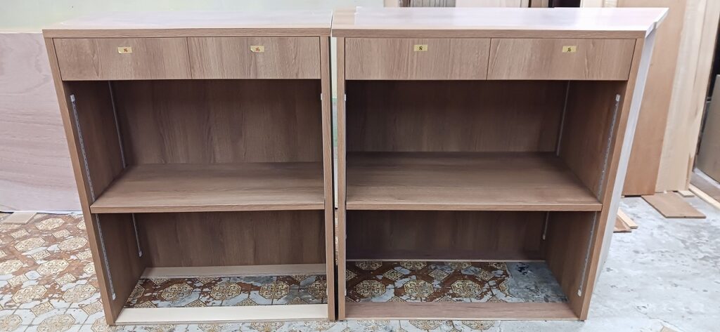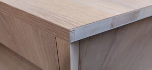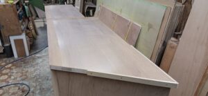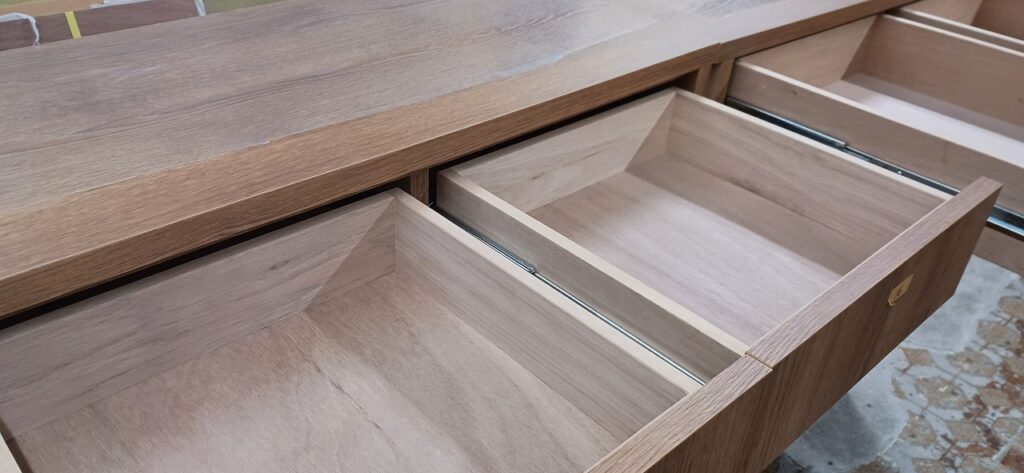 2026.01.06 Pointed Edge まだお正月休みの人が多いのか心なしか街が静かな冬晴れの火曜日。w1500×h1050×d500㎜サイズの異形カウンター収納、鋭いポインテッドカットが施された傾斜天板下に奥行の異なる引出を4杯装備、引出下にはアルミ製棚柱の可動棚を2枚配備した大容量ストッカー、内外装共にホワイトオーク板柾柄メラミン化粧板仕様、引出杯はラワン仕上げ。
