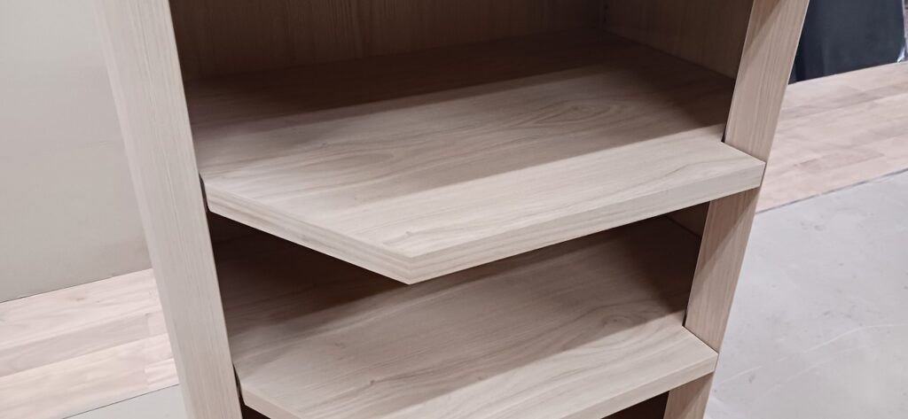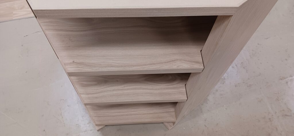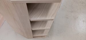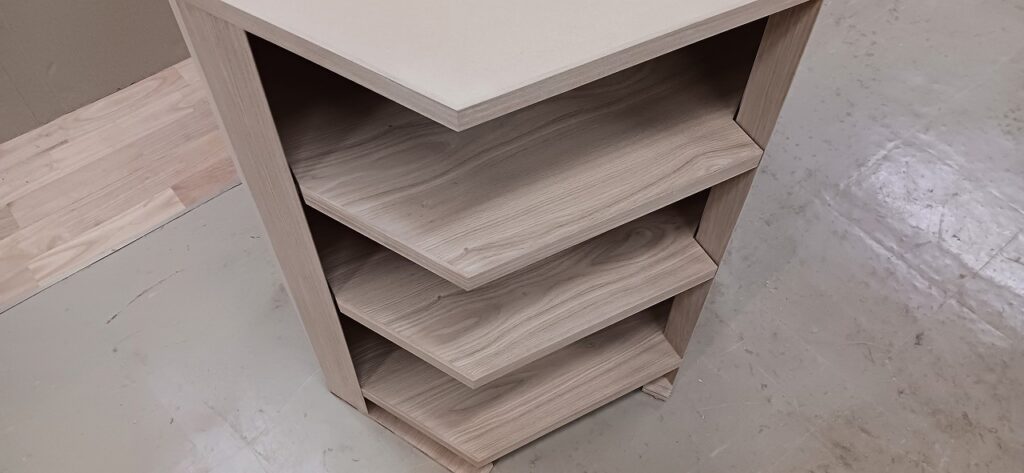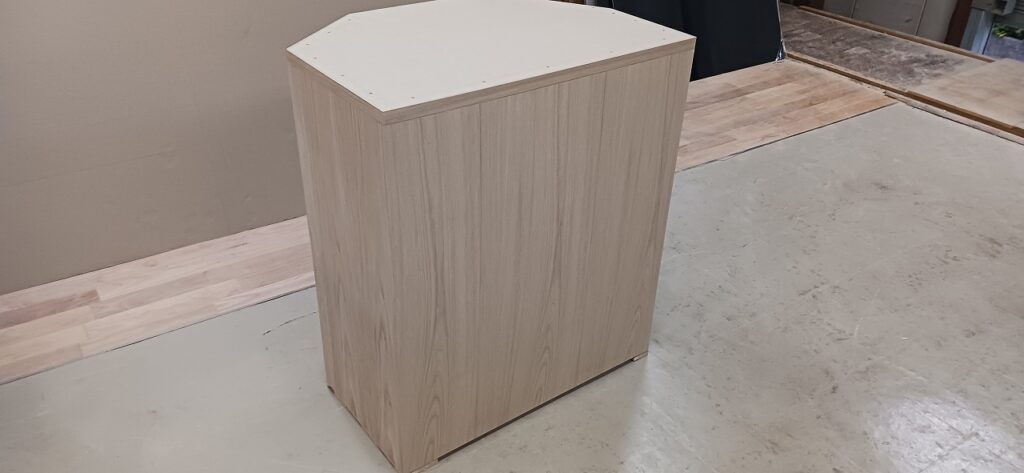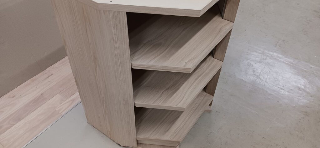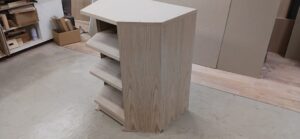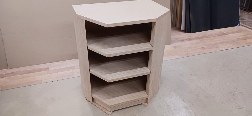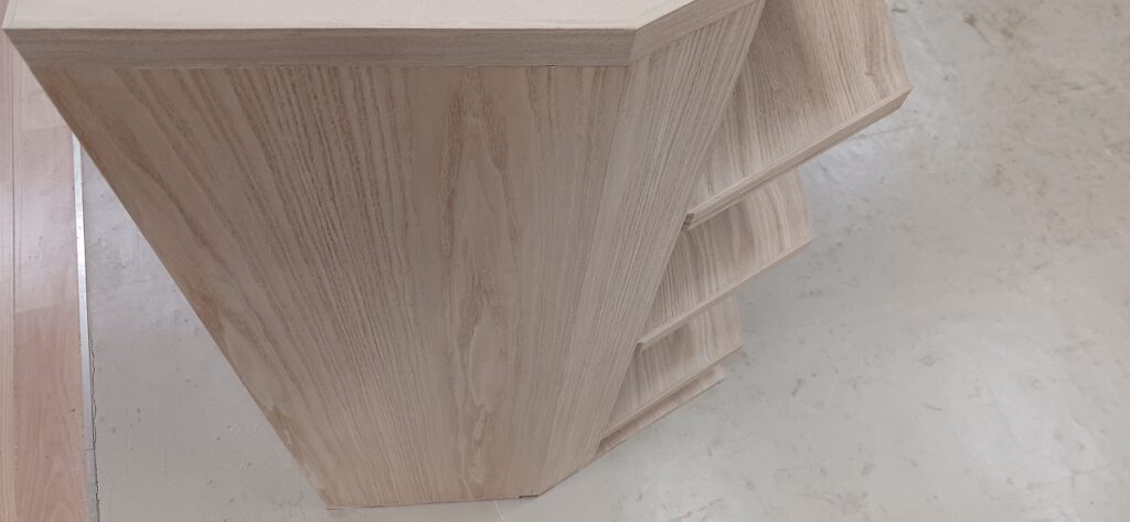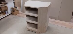 2025.12.16 special hex 風もなくあまり寒くない冬晴れの火曜日。≒w800×h1300×d600㎜サイズの変則的な六角形型の収納棚、ひとつとして同じ角度を持たない独特の形状は、無垢材・板材・ロール材を適材適所で多用した特別な構造、全てホワイトオーク材で仕上けられたオブジェの様な収納キャビネット。
