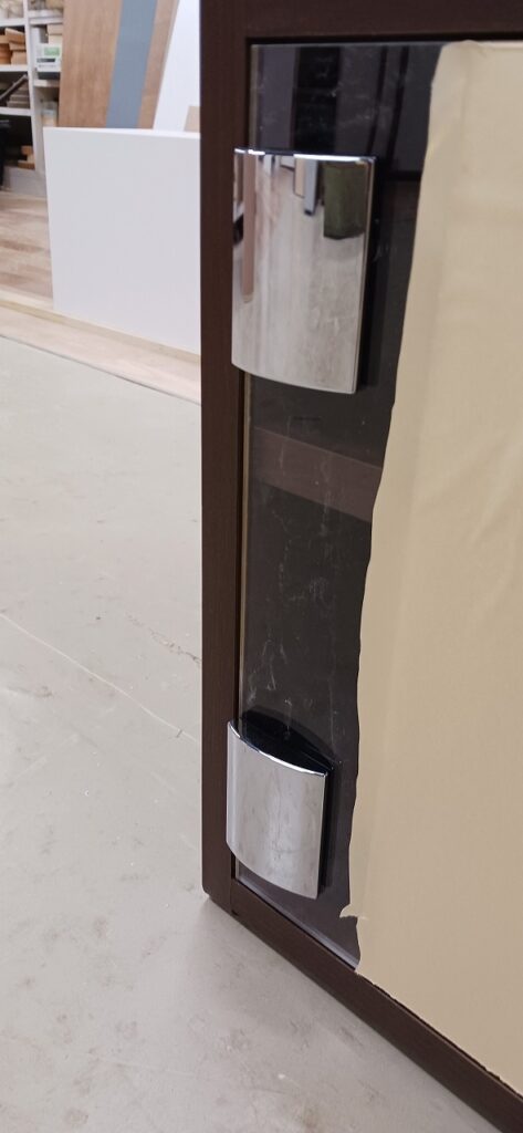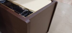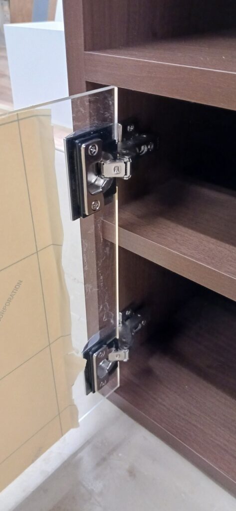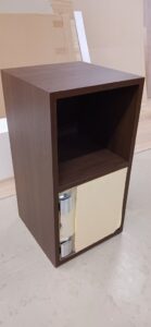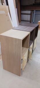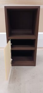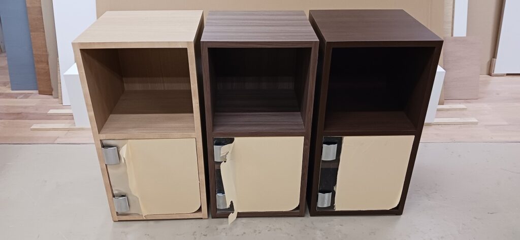 2025.11.11 uno, due, tre 風もなくあまり寒くない花曇りの火曜日。w400×h800×d400㎜サイズのミニキャビネット、本体上部はオープン棚、下部はアクリル製扉に可動棚が付いた収納スペース、扉コーナーをラウンドカットしたツマミを付けないシンプル仕様、本体底面もサイドパネルをR形状にセーフティカットした壁吊り設置専用デザイン、オークとアッシュ柾目柄のダーク・ミデアム・ライトカラー、各内装色に合わせたスリーカラーバリエーション。